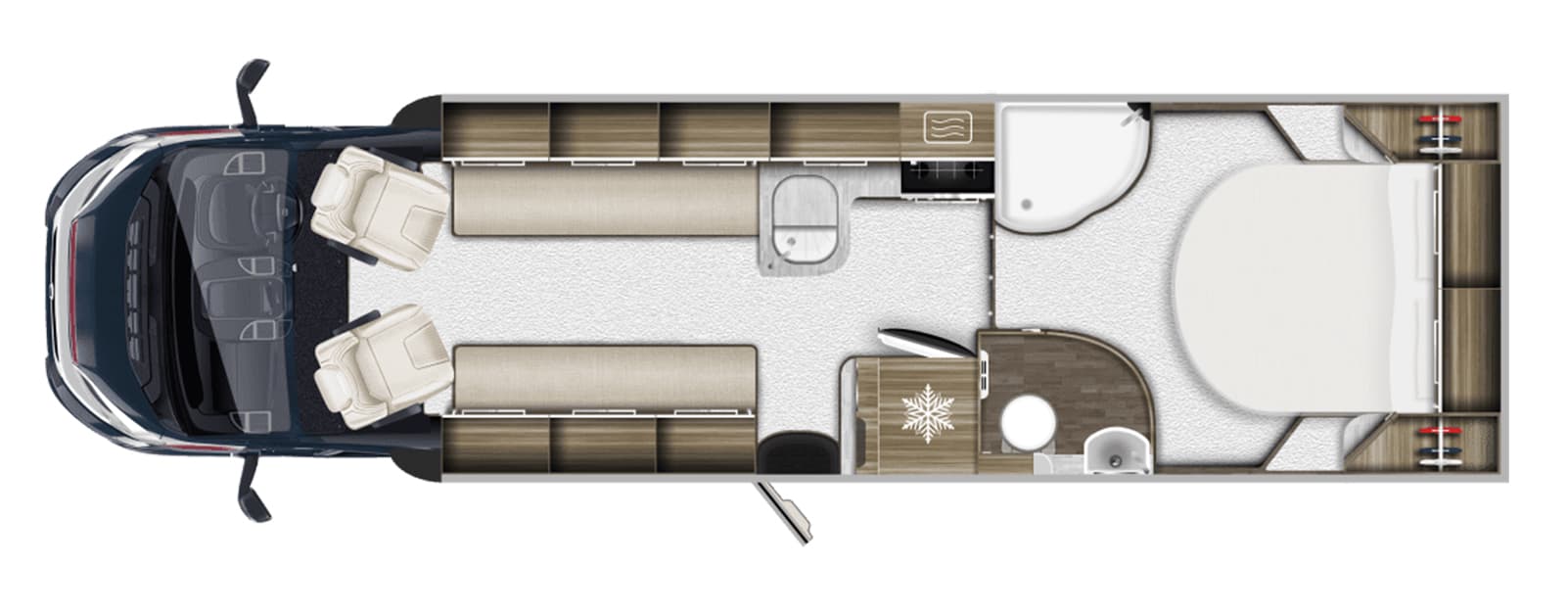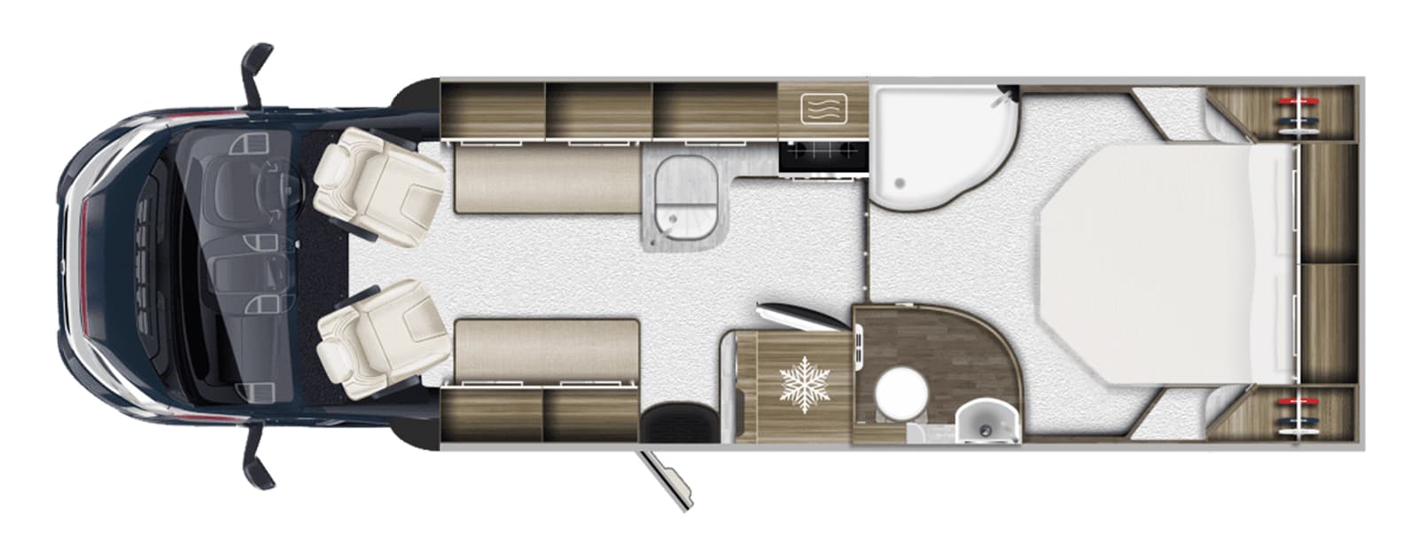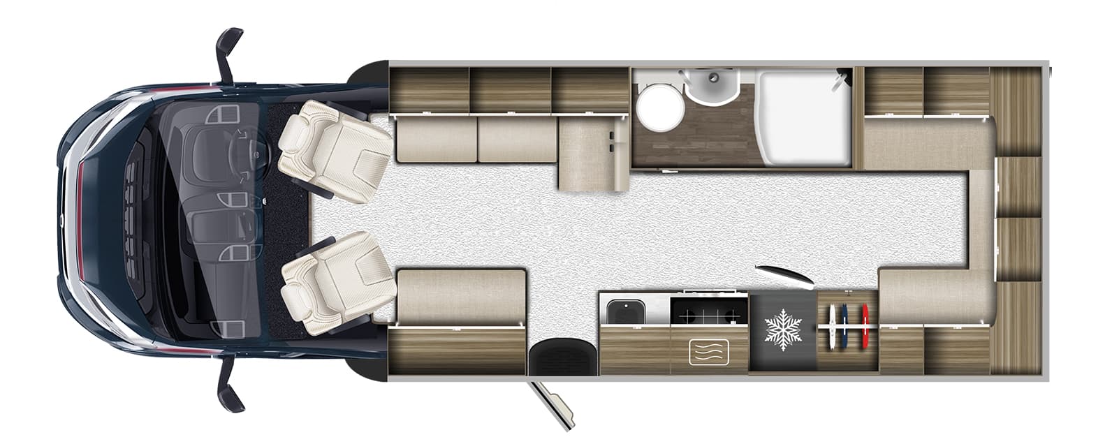 With a shortest length model of 6.20m(602G), up to 6.90m in the 690G and an optional pop-top, it strikes the perfect balance between driving convenience and comfortable living.