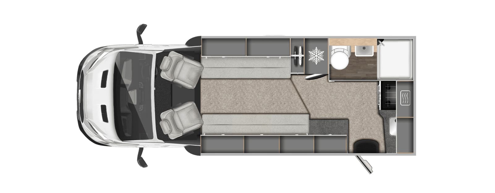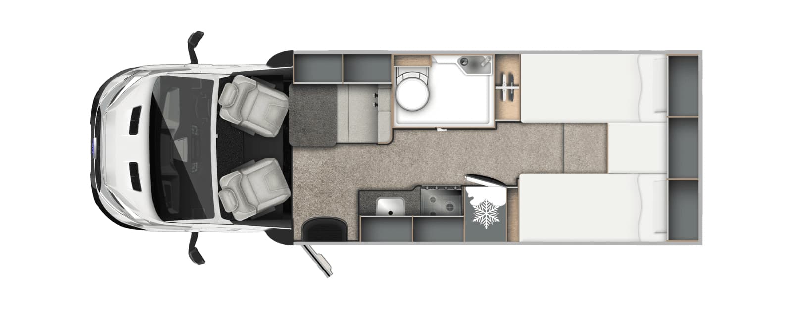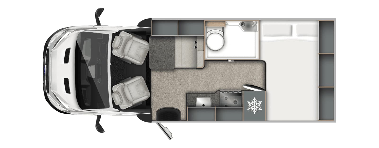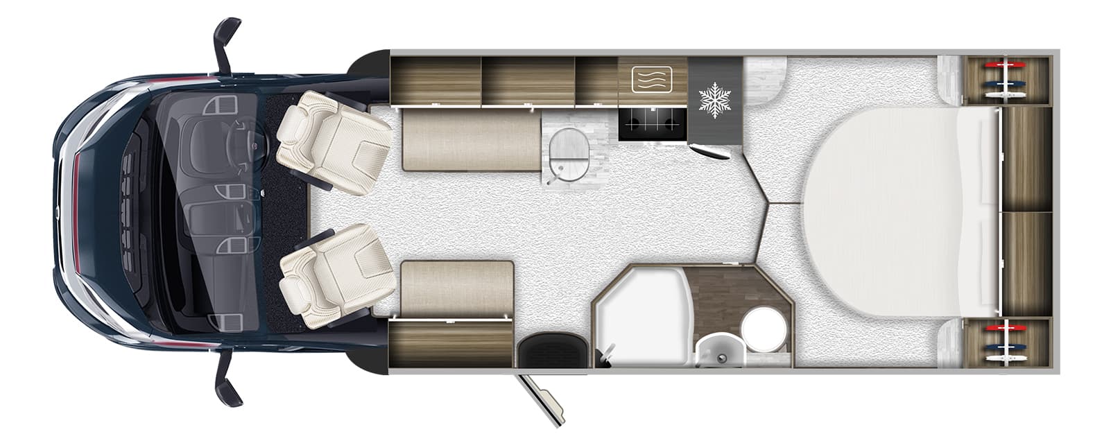 With a shortest length model of 6.20m(602G), up to 6.90m in the 690G and an optional pop-top, it strikes the perfect balance between driving convenience and comfortable living.