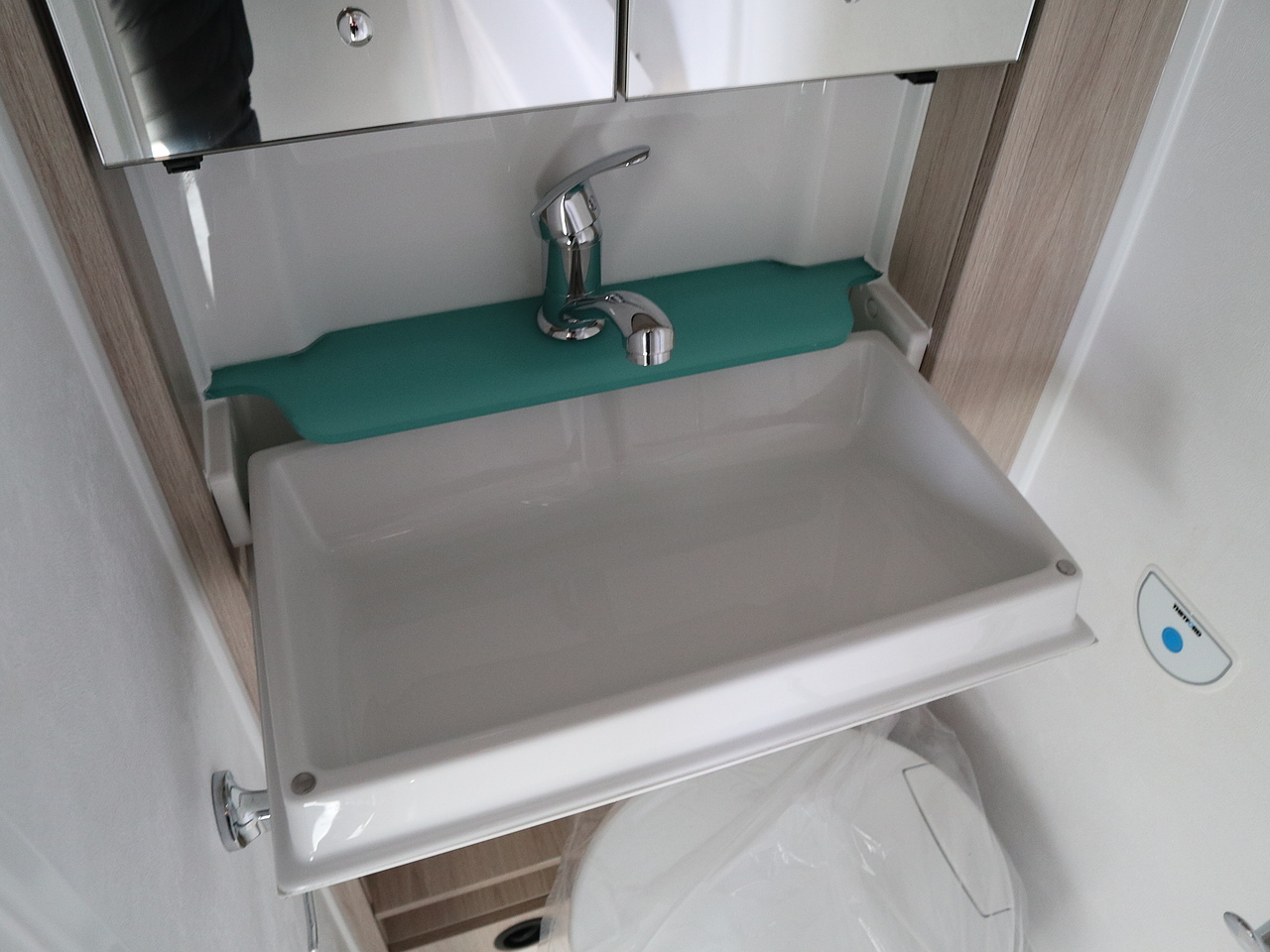 -Washroom: A compact, wet-room style bathroom features a shower, a cassette toilet, and a hand basin.