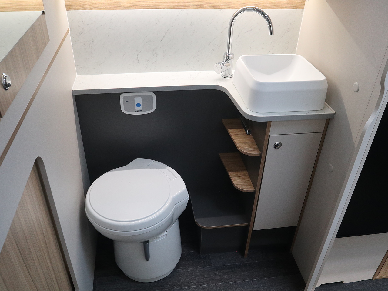 It offers a spacious and modern bathroom that features a fully enclosed shower cubicle, Thetford cassette toilet, and washbasin with a mirror. The bathroom is not only functional but also thoughtfully designed to maximize space, providing a comfortable experience for those who want to freshen up while on the go.