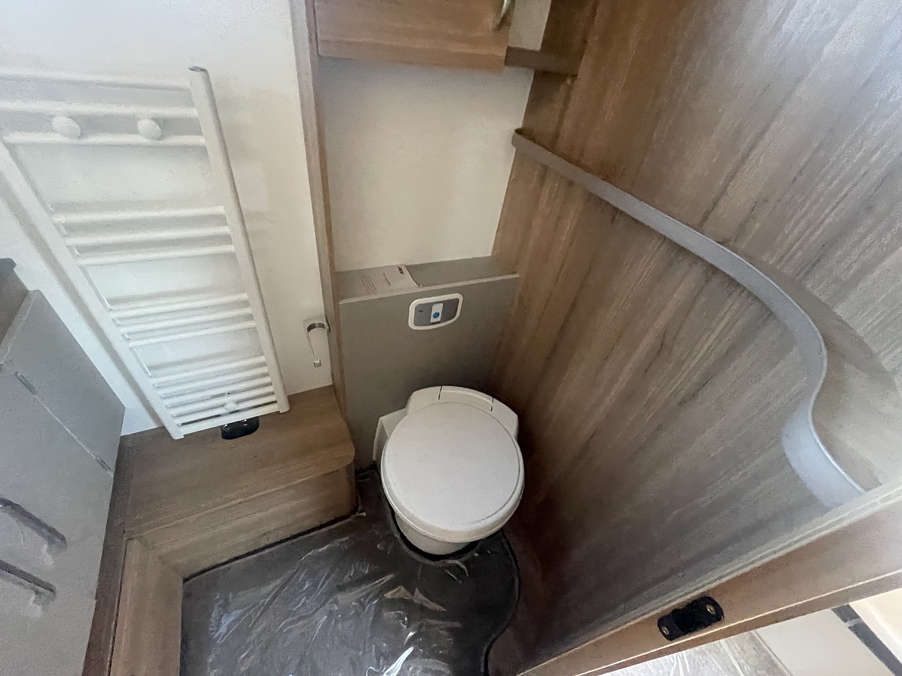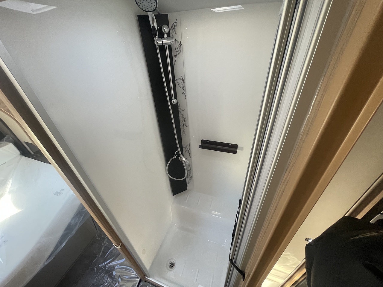 Premium Washroom - Full-width rear washroom with separate walk-in shower, electric flush toilet, and heated towel rail.