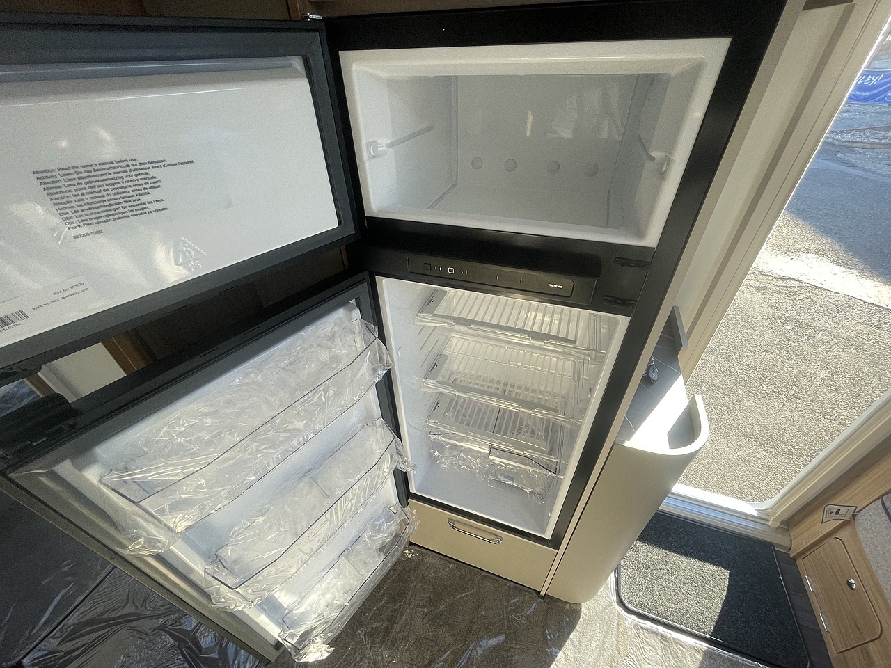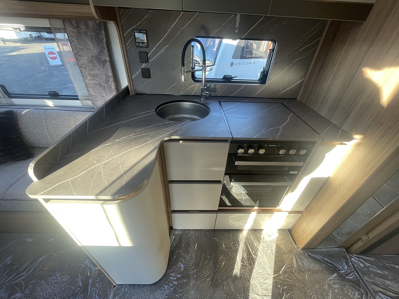 Fully Equipped Kitchen - Large Thetford dual-fuel hob, oven, and grill. 156L tower fridge with 29L freezer compartment. Deep stainless-steel sink with mixer tap and stylish splashback.