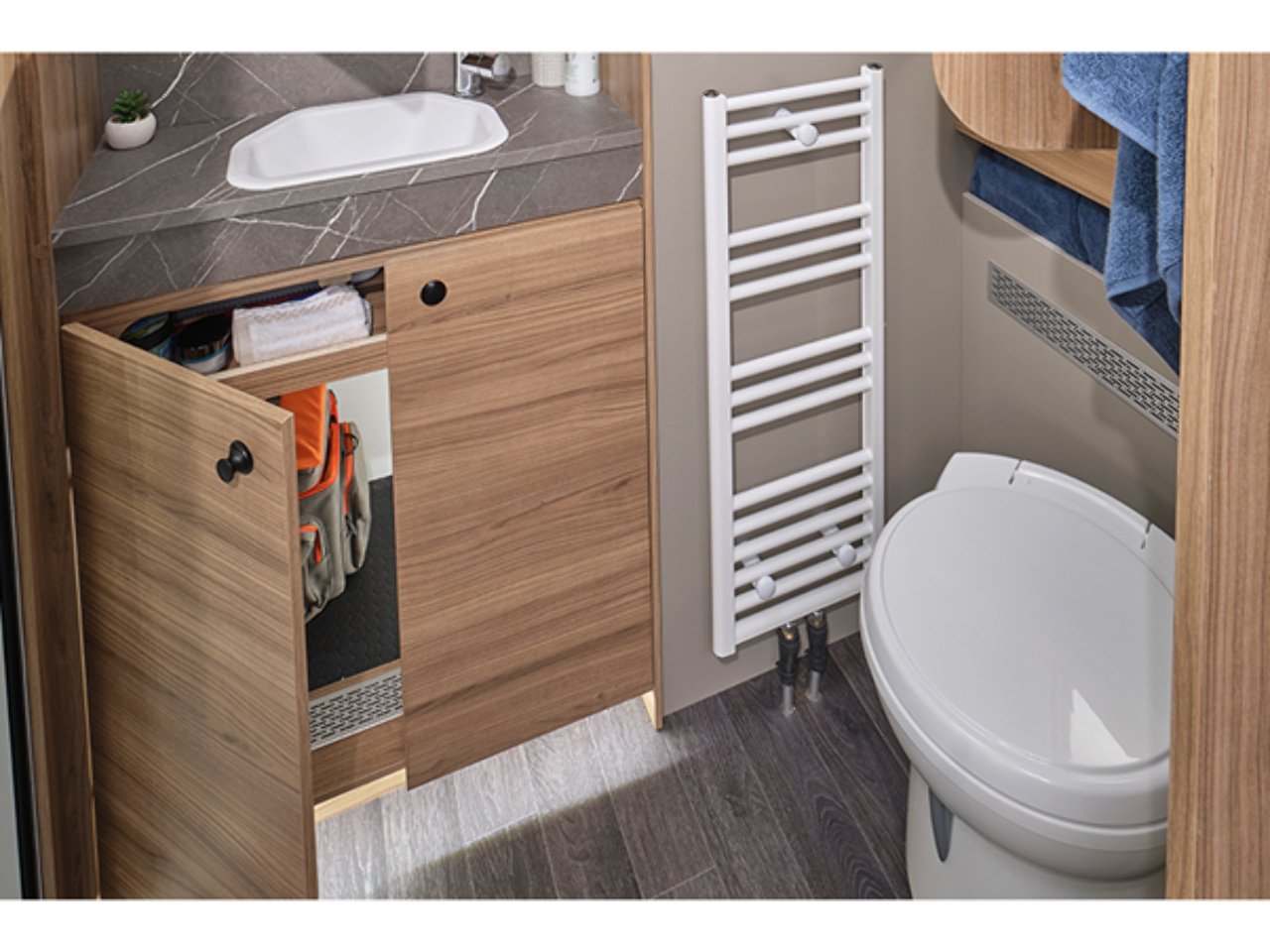 Two-berth luxury: For couples who want space and comfort (rather than family layout compromises), this model offers a very good layout: dedicated lounge, drop-down bed (so lounge area is fully usable during the day), generous washroom and storage.