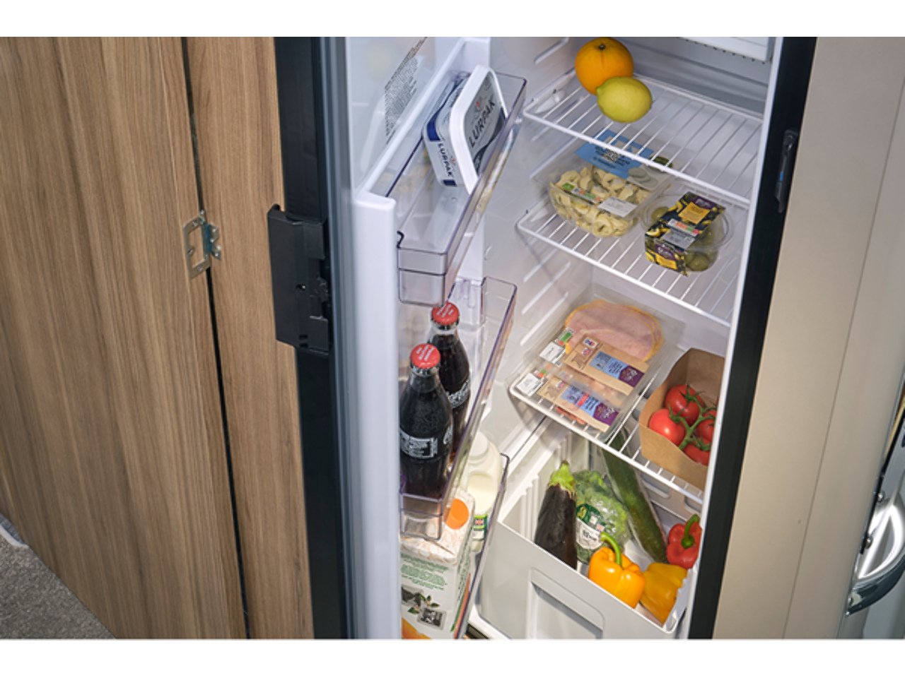 Fully equipped kitchen: Thetford 137 L absorption tower fridge (15 L freezer), dual-fuel hob, oven/grill, and plenty of workspace.