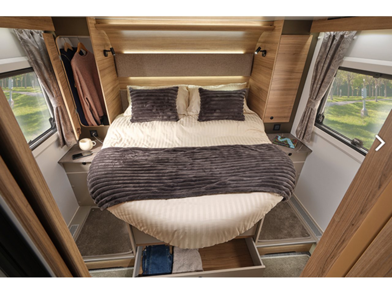 A smart rear fixed island double bed gives you a permanent, comfortable main bed — no converting the lounge every night.