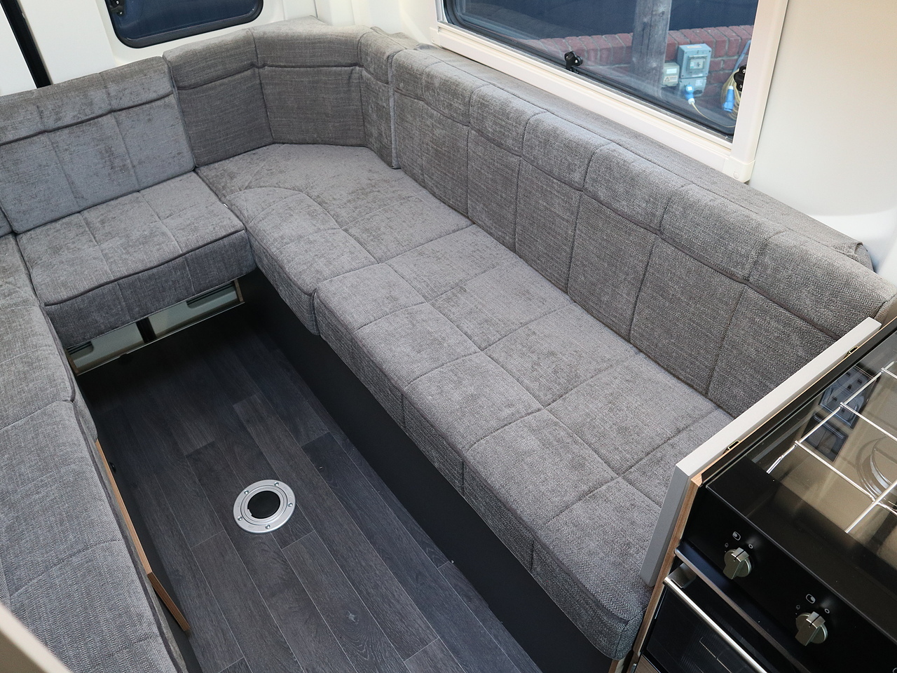 There’s ample storage beneath the bench seats, perfectly sized for Duvalay sleep systems. Mattresses roll up neatly and stow away under the lounge seats, keeping the living area uncluttered.