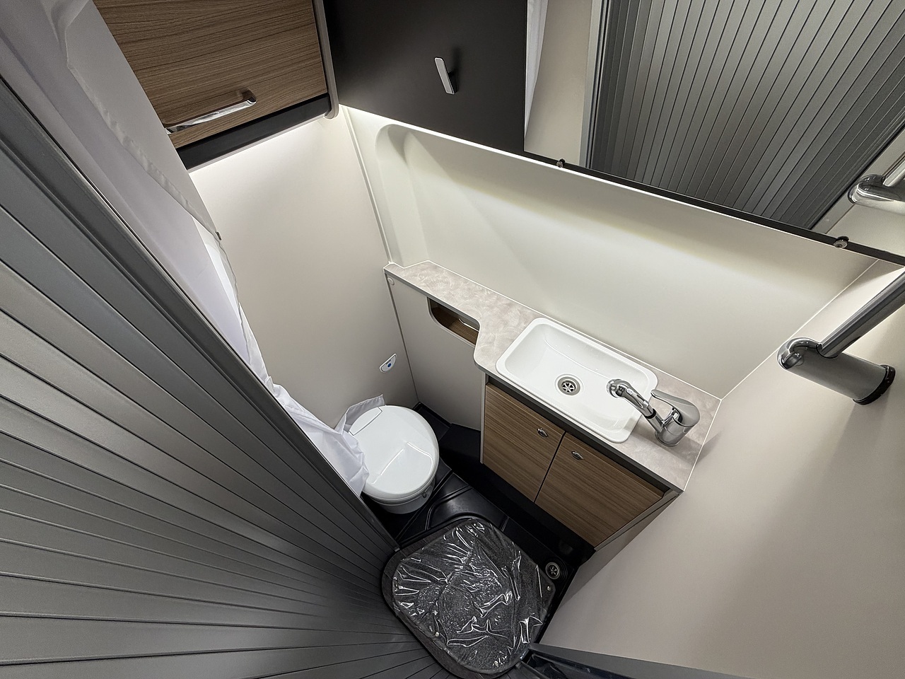 Washroom Compact washroom with shower, cassette toilet, tambour door