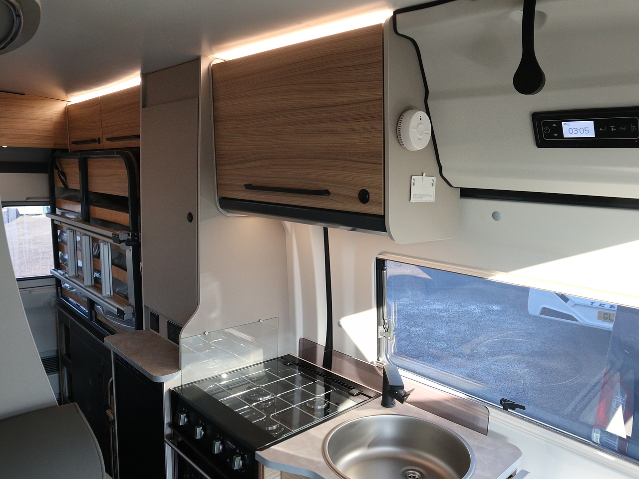 -Fully equipped kitchen with a Thetford 90L compressor fridge, 3-ring gas hob, combination oven, and grill