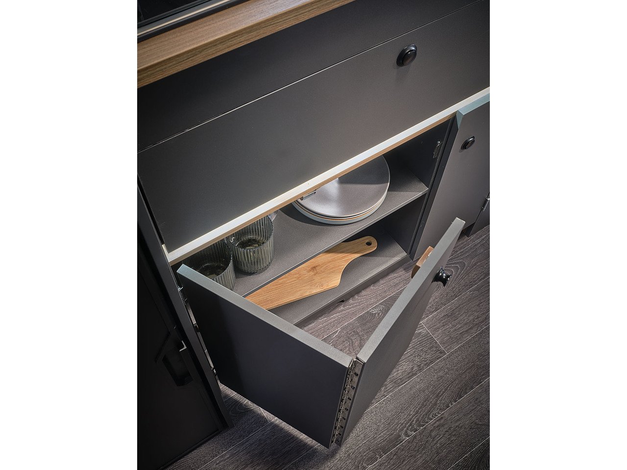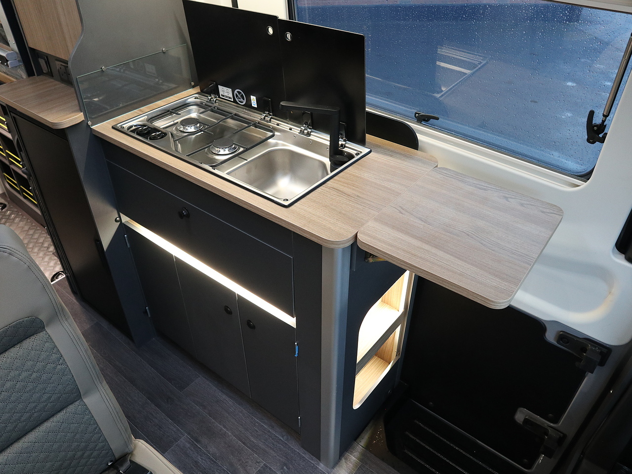 • Drop-down worktop extension and combination Dometic 2-burner hob, sink, and fold-down tap