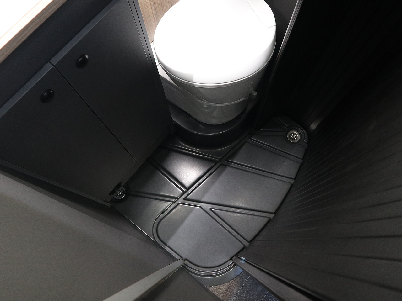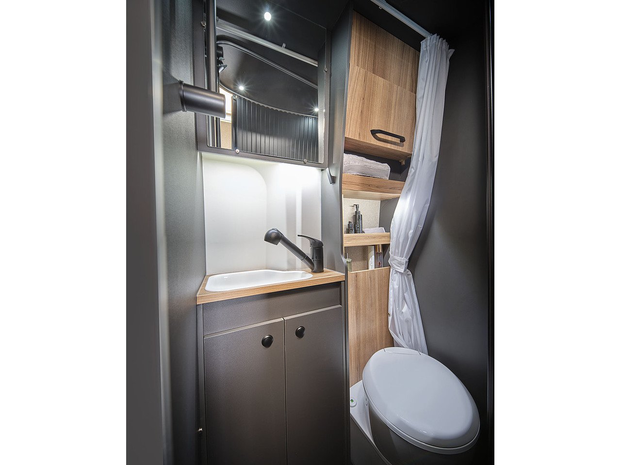 • Compact, functional bathroom with onboard shower, Thetford 12V electric flush toilet, and rotating tambour partition