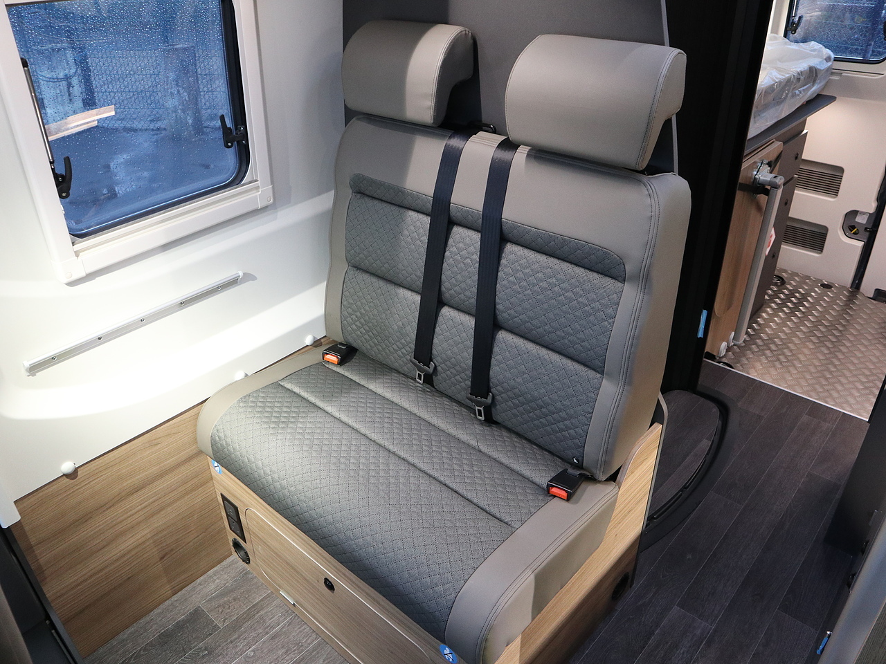 • Front dinette lounge with dedicated travel seats, ISOFIX, and wall-mounted table