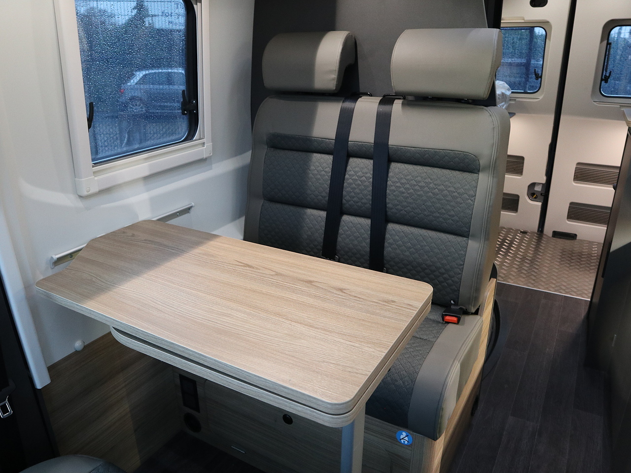 • Front lounge with twin travel seats, ISOFIX, and wall-mounted multi-position dining table