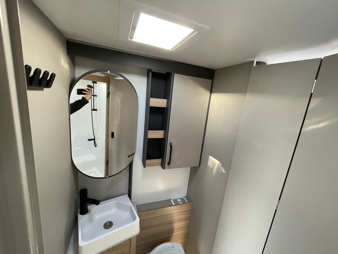 At the front is a bright, spacious lounge with twin parallel seating, large panoramic front window and integrated ambient lighting. The 8ft width enhances the feeling of openness, making this a perfect space for relaxing or entertaining. The lounge converts into an additional double bed when required, creating flexible sleeping for 4 people.