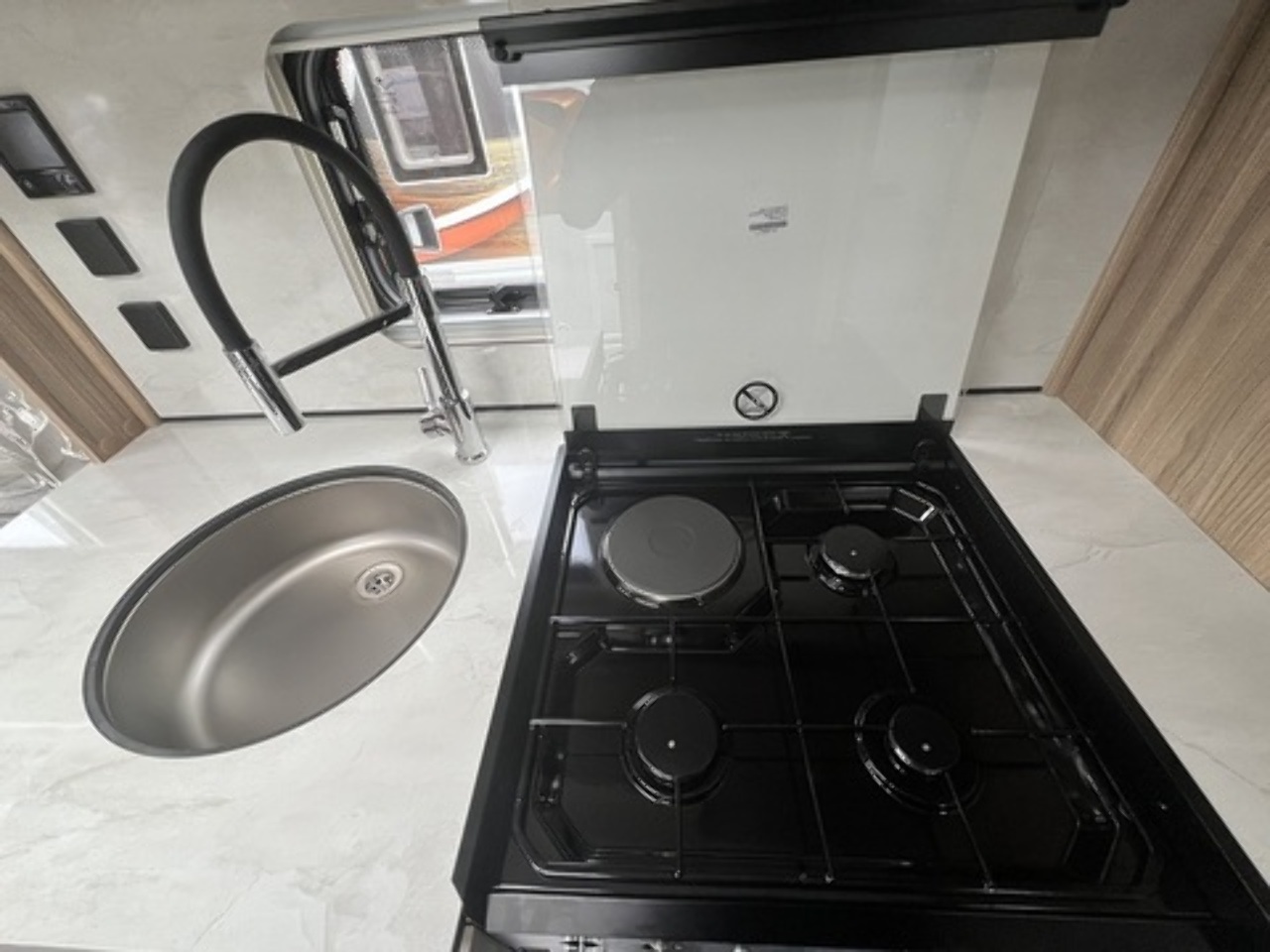 • Under-mounted stainless steel sink with swan-neck flexi tap and integrated chopping board set