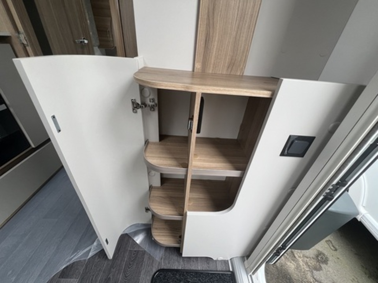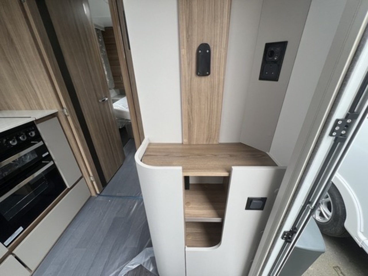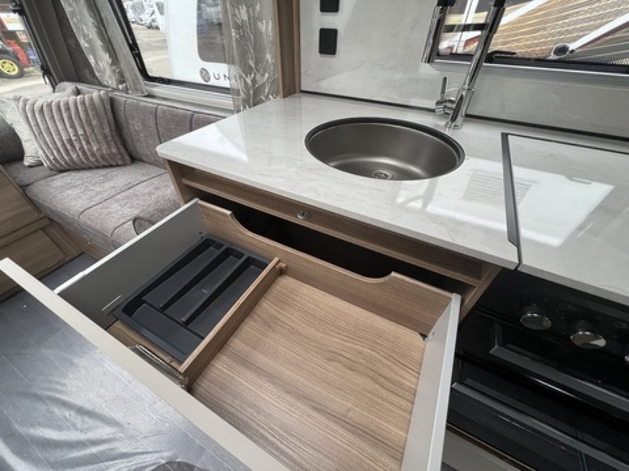 • Pull-out wire basket storage, soft-close drawers, and upgraded 137-litre Thetford fridge/freezer