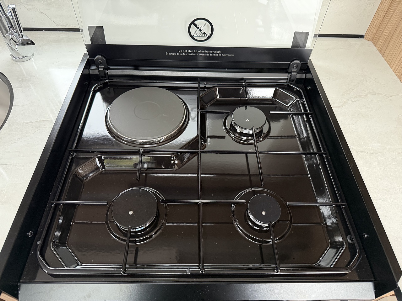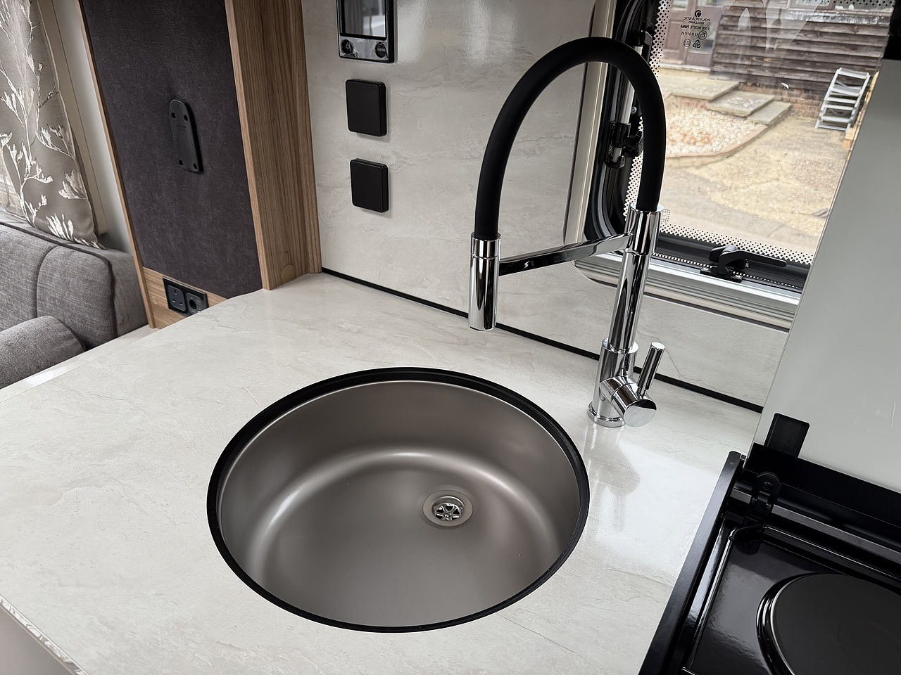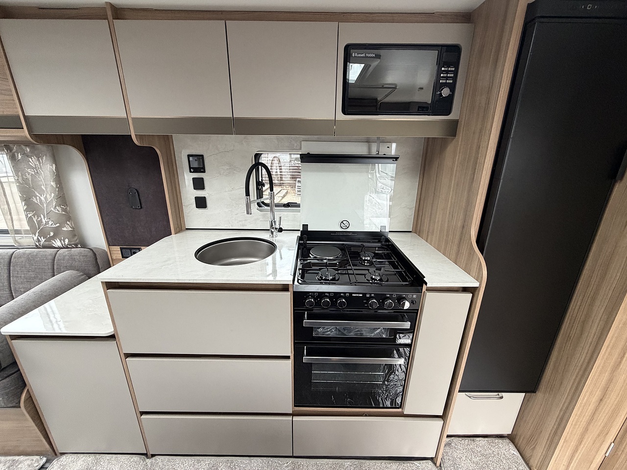 The well-appointed kitchen boasts “Baystone” worktops, soft-close drawers, a 137L Thetford fridge, and a dual-fuel hob, all designed to make meal prep on the go as enjoyable as at home. Other standout features include dimmable zonal lighting, USB-C charging ports, a wireless charging pad, a SONOS portable speaker, a TRACKER Monitor security system, and full Thatcham-approved safety credentials. With a MTPLM of just 1,550kg and a generous payload, the Madrid remains highly towable without compromising on space or comfort.