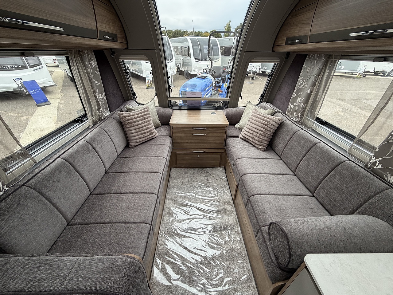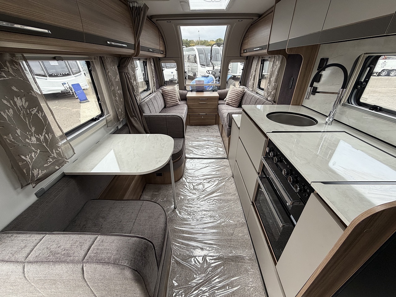 This latest evolution of the award-winning Unicorn range features an eye-catching exterior with chrome and bronze detailing, a dramatic infinity front window, and premium finishes inside including Natural Oak cabinetry and soft furnishings in “Blossom” fabric.