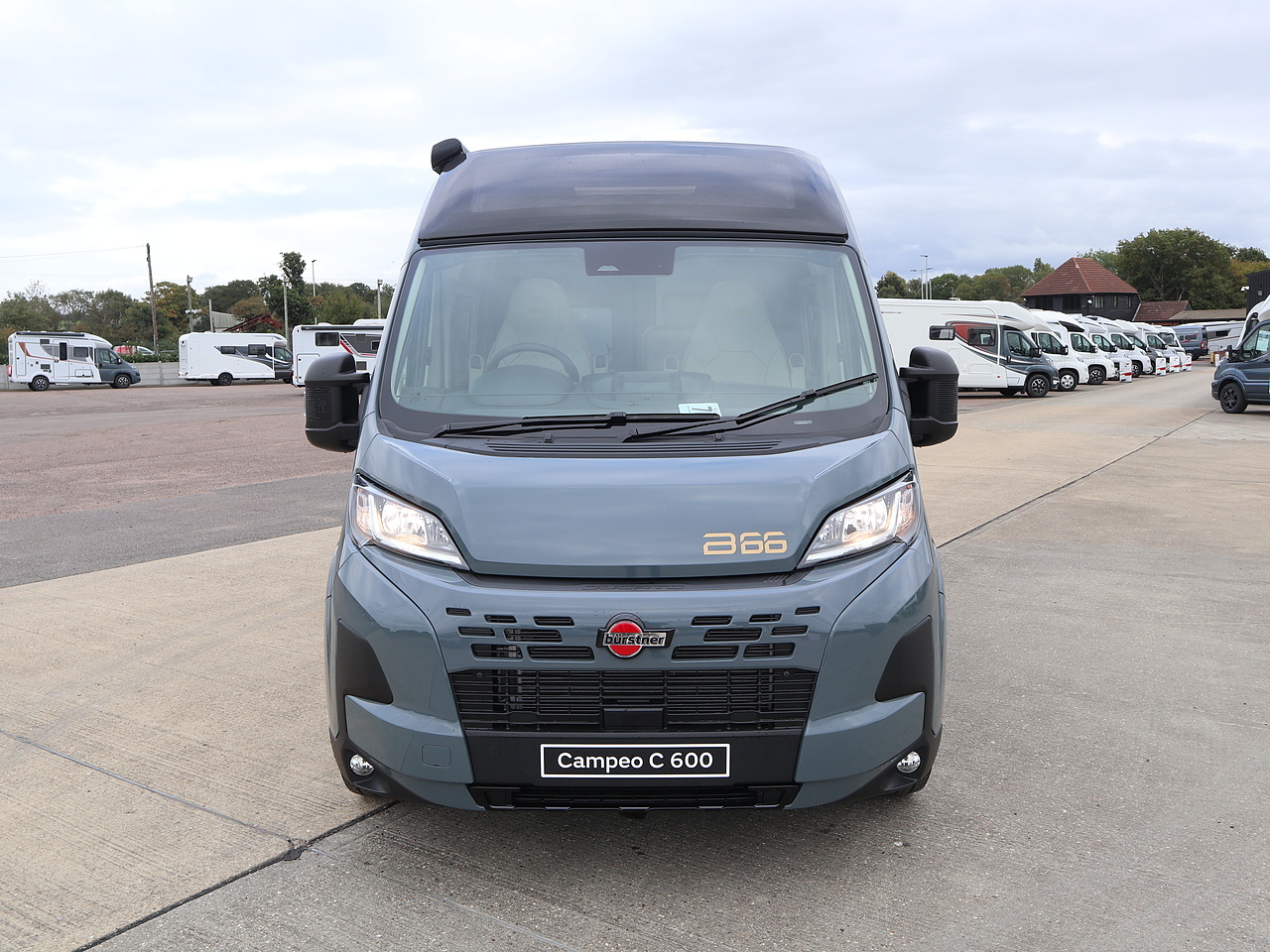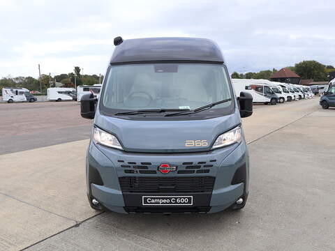 The Bürstner Campeo C 600 is a popular compact campervan built on a Fiat Ducato chassis, featuring a practical layout, a half-dinette lounge, and a rear transverse double bed.