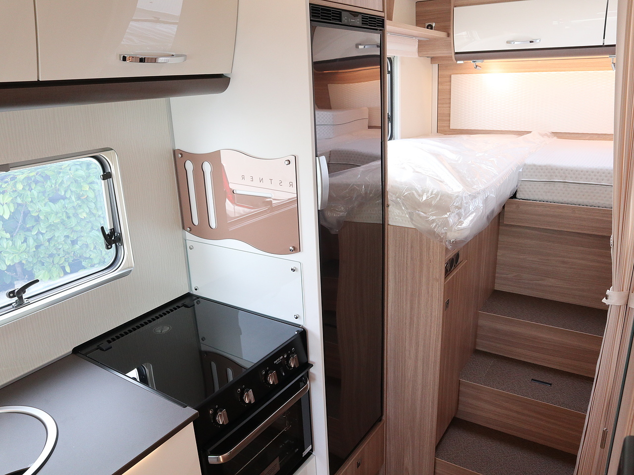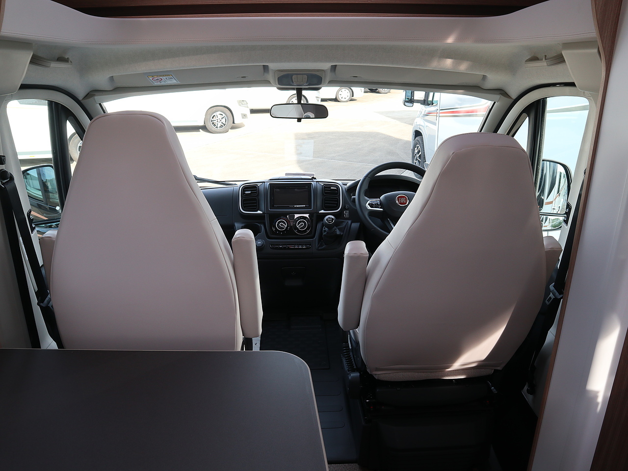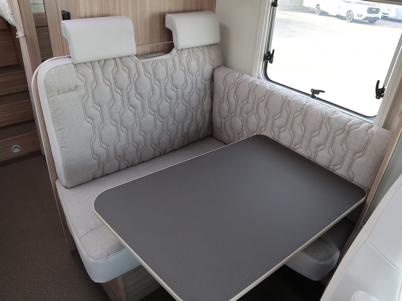 The Burstner Limited T 690G is a low-profile motorhome with a layout featuring a front lounge, a central kitchen and washroom, and twin single beds at the rear situated over a full-width garage. It is a versatile vehicle with a configuration of 3-berth with 4 travel seats
