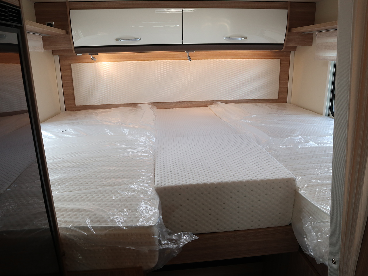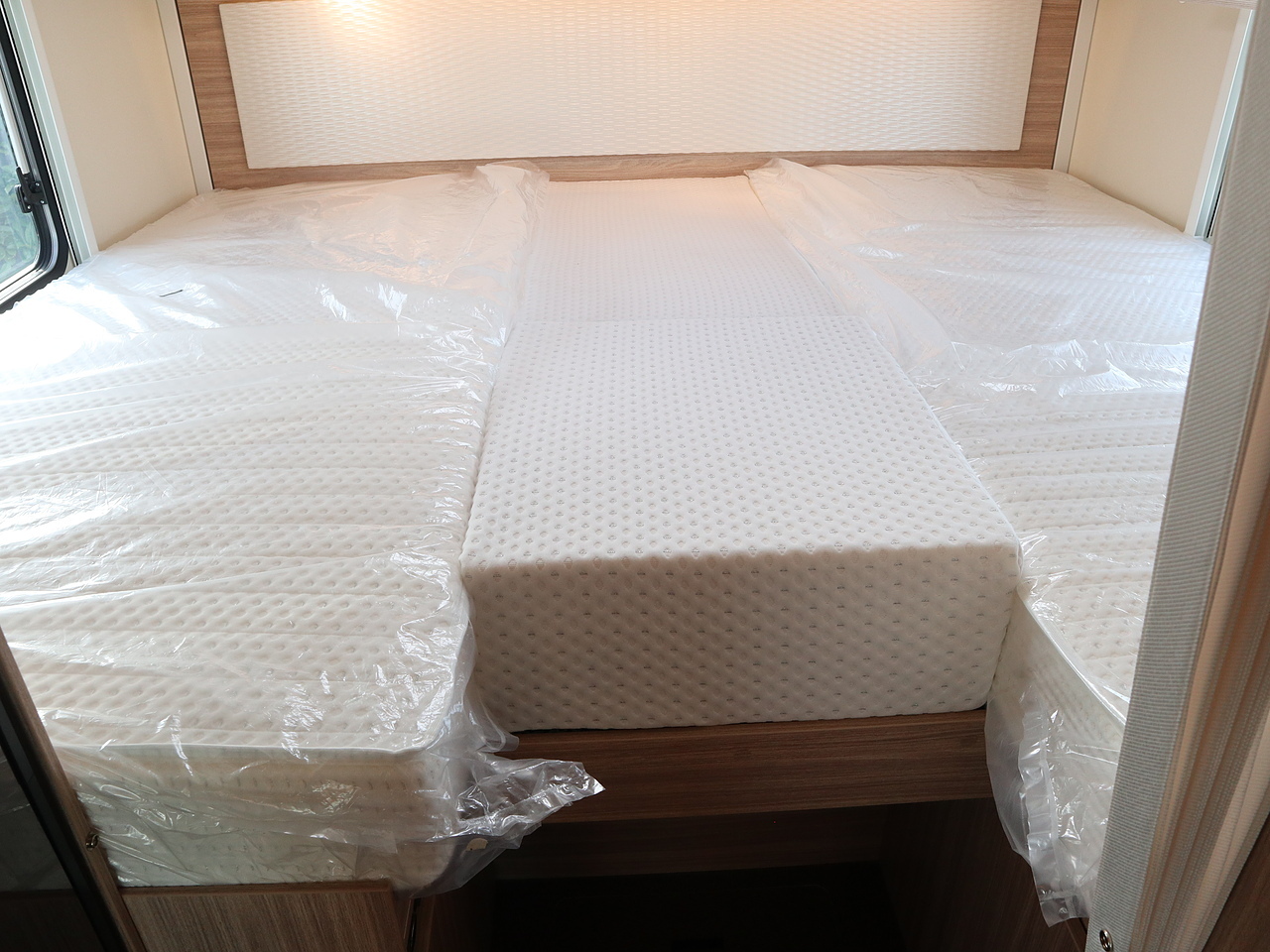 Sleeping arrangements: The main beds are two fixed single beds at the rear, which can be converted into a large double bed using a sliding element and cushions.