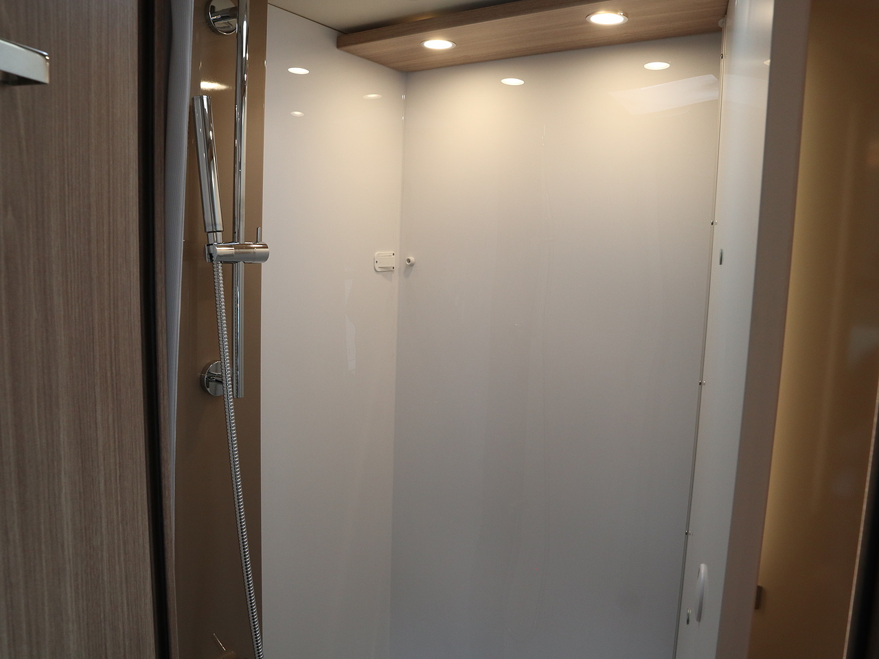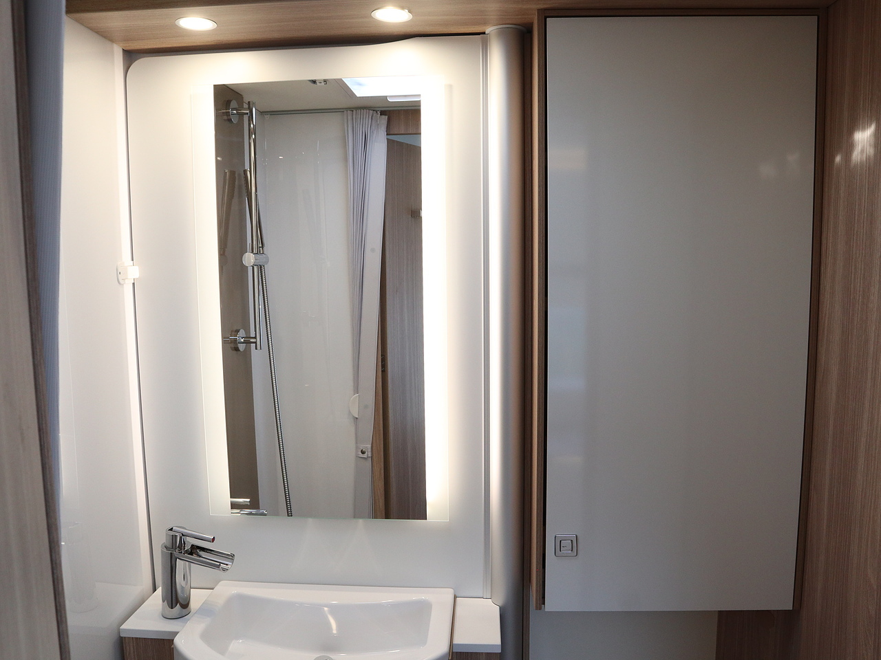 Washroom: Opposite the kitchen, the spacious all-in-one washroom features a cassette toilet and a "swing-wall" partition to create a separate shower cubicle.