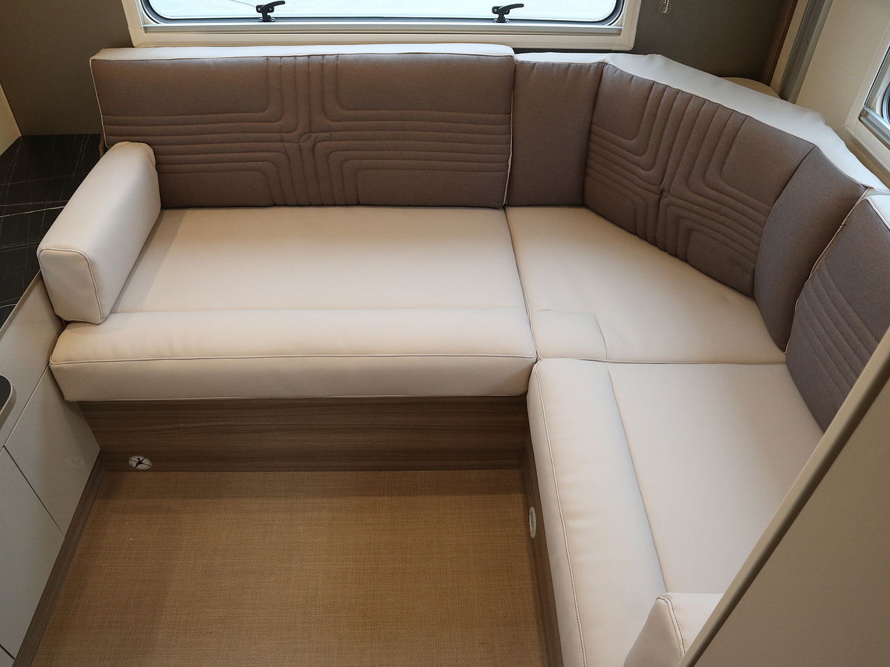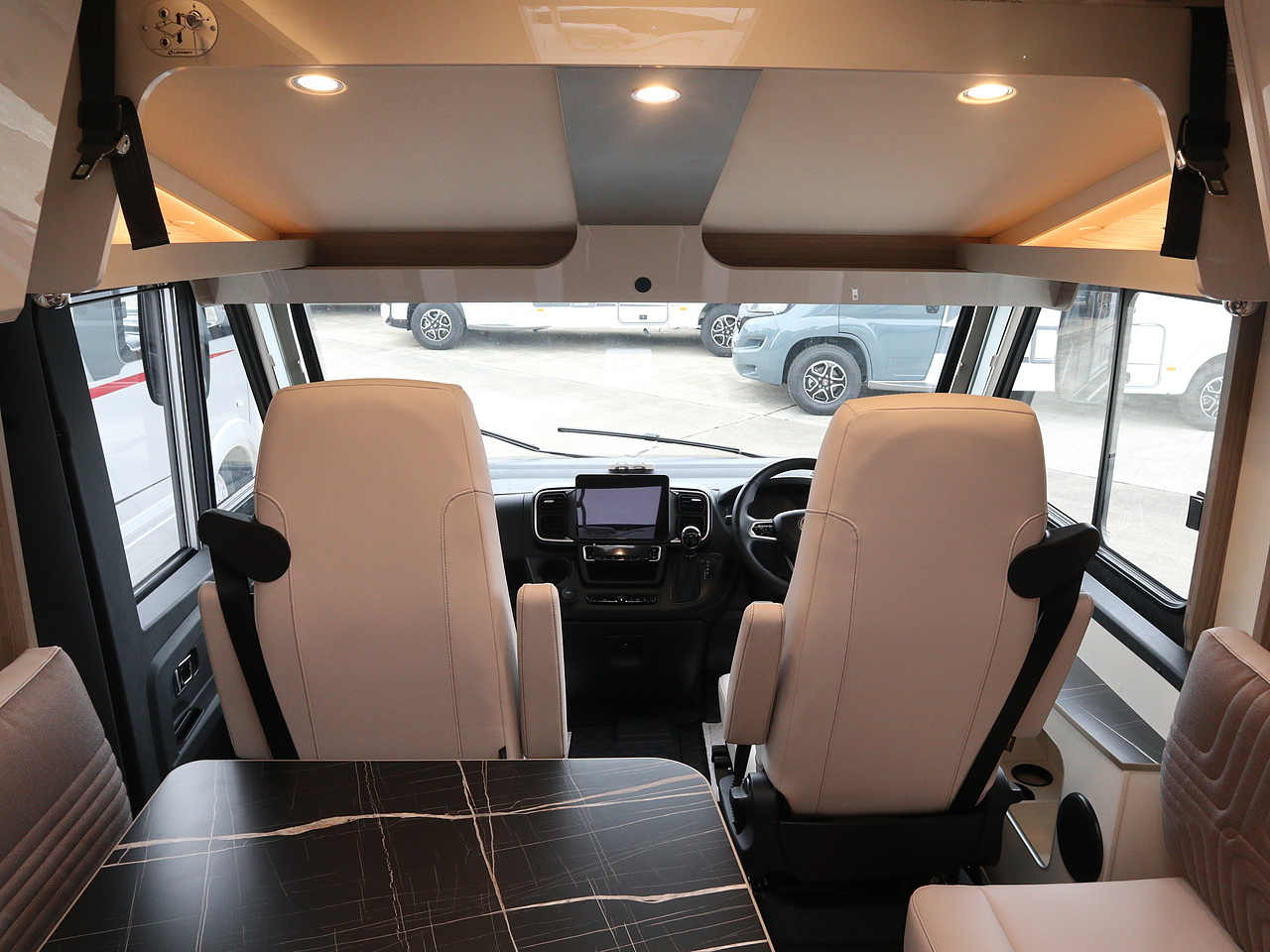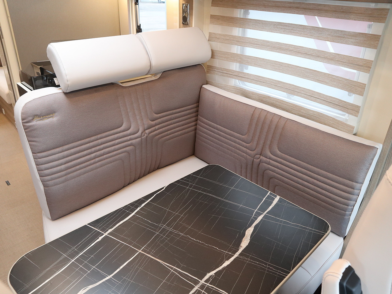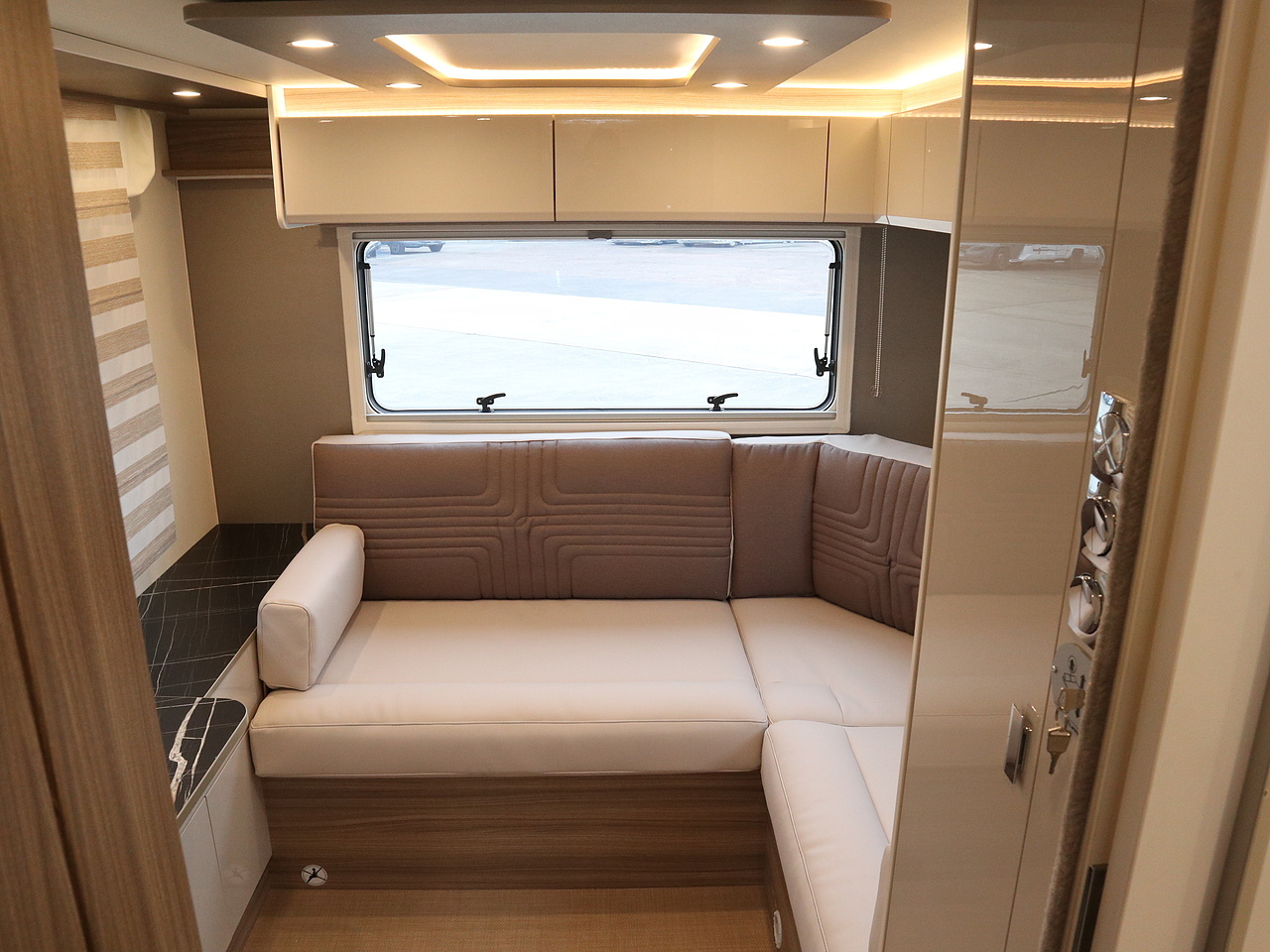 Front dinette: A conventional L-shaped half-dinette and swivelling captain's chairs provide a second living/dining area. An electric drop-down bed is located above this area as well, offering a second double bed.