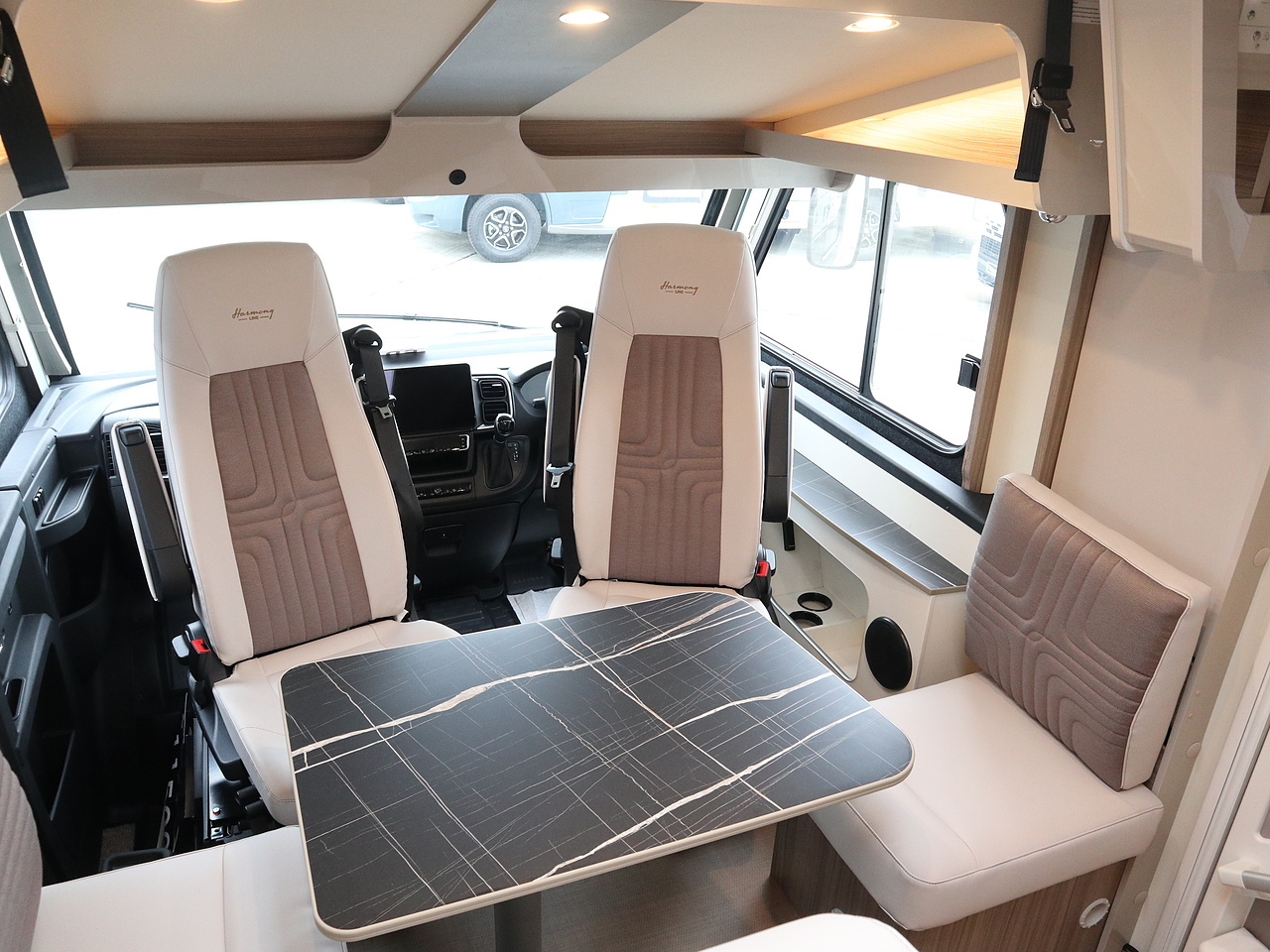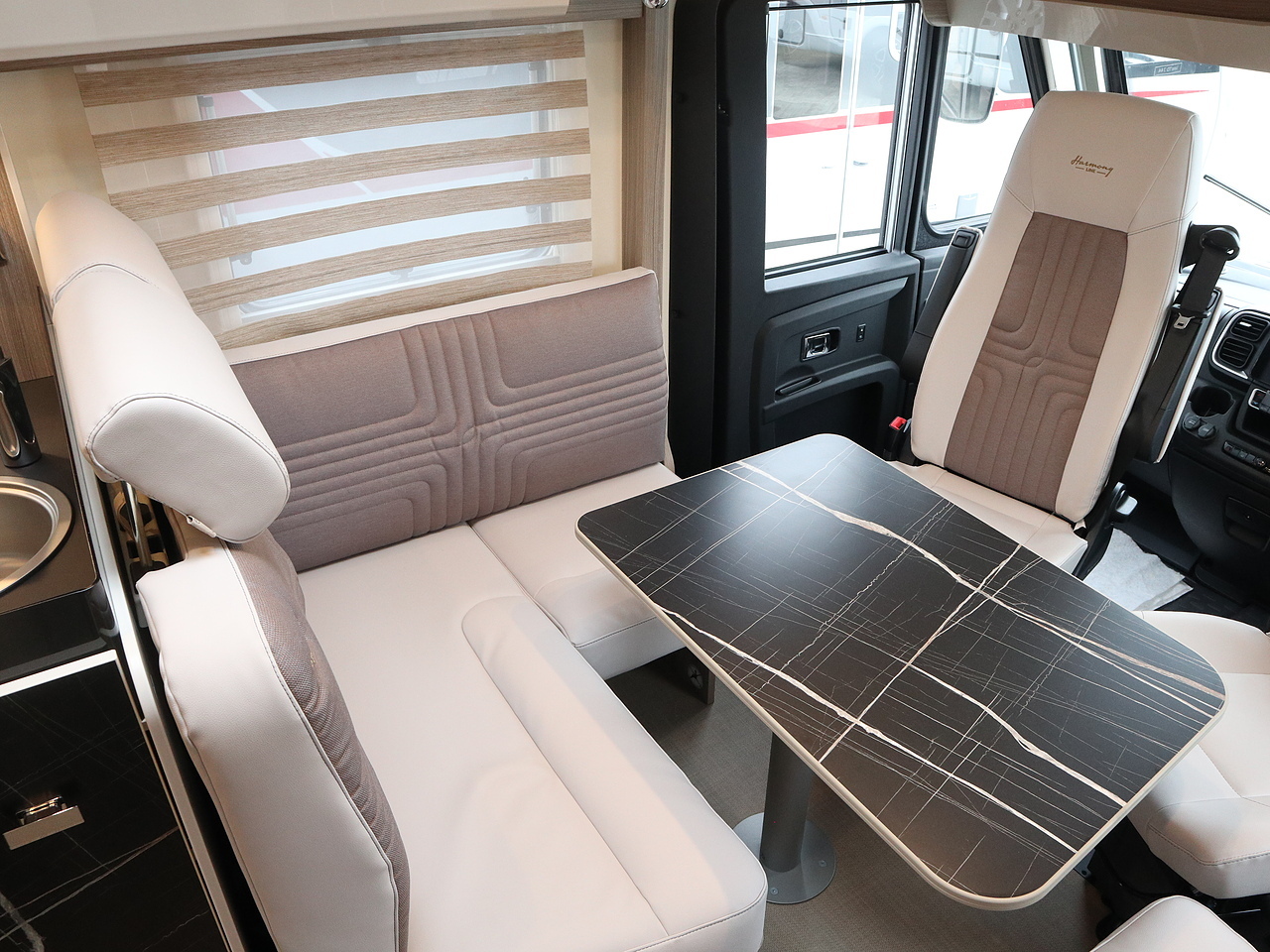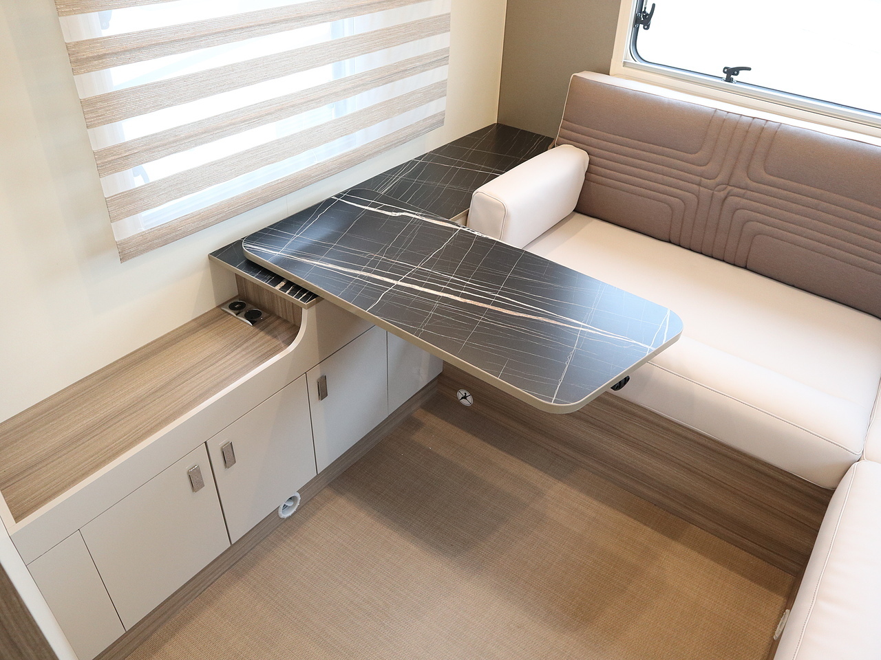 Front dinette: A conventional L-shaped half-dinette and swivelling captain's chairs provide a second living/dining area. An electric drop-down bed is located above this area as well, offering a second double bed.
