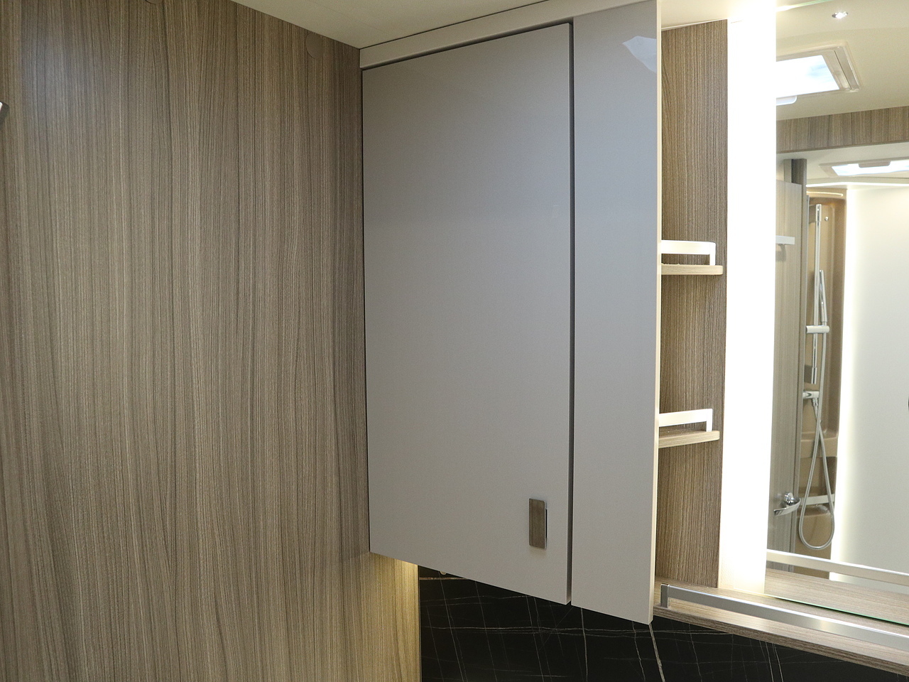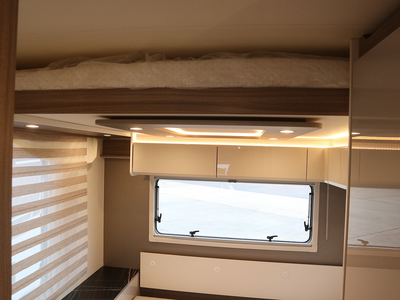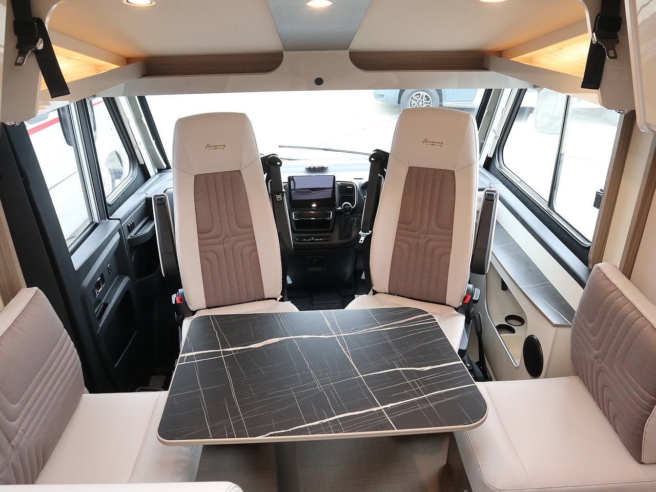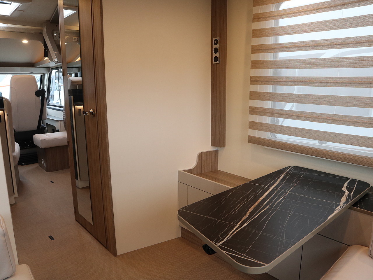 Front dinette: A conventional L-shaped half-dinette and swivelling captain's chairs provide a second living/dining area. An electric drop-down bed is located above this area as well, offering a second double bed.