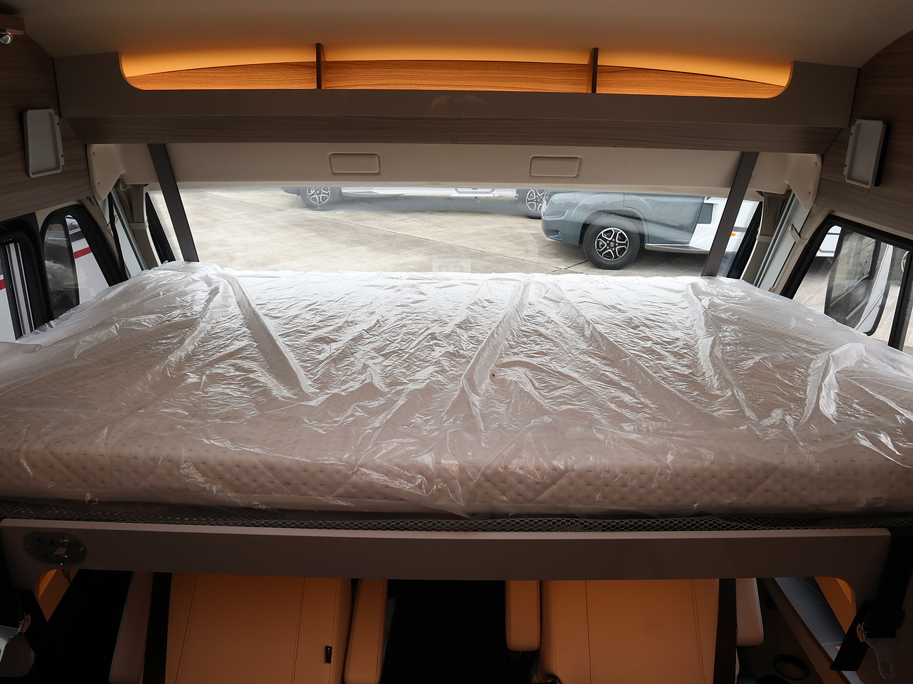Rear lounge: An L-shaped settee along the nearside and rear walls, with a sideboard and movable table. An electric drop-down double bed lowers from the ceiling above the lounge.