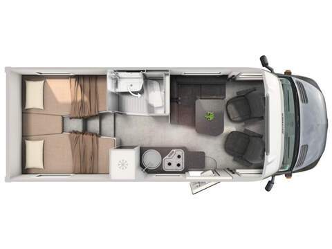 The rear features twin single beds with HYMER’s Sleeping Comfort system — including multi-zone cold foam mattresses, cup slatted frames, and custom-fitted sheets — which can convert to a large double using the infill cushion.