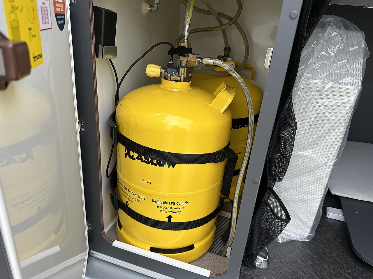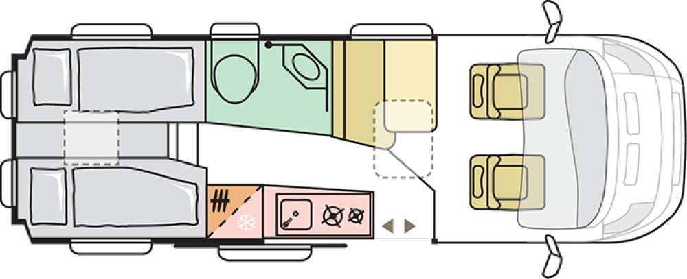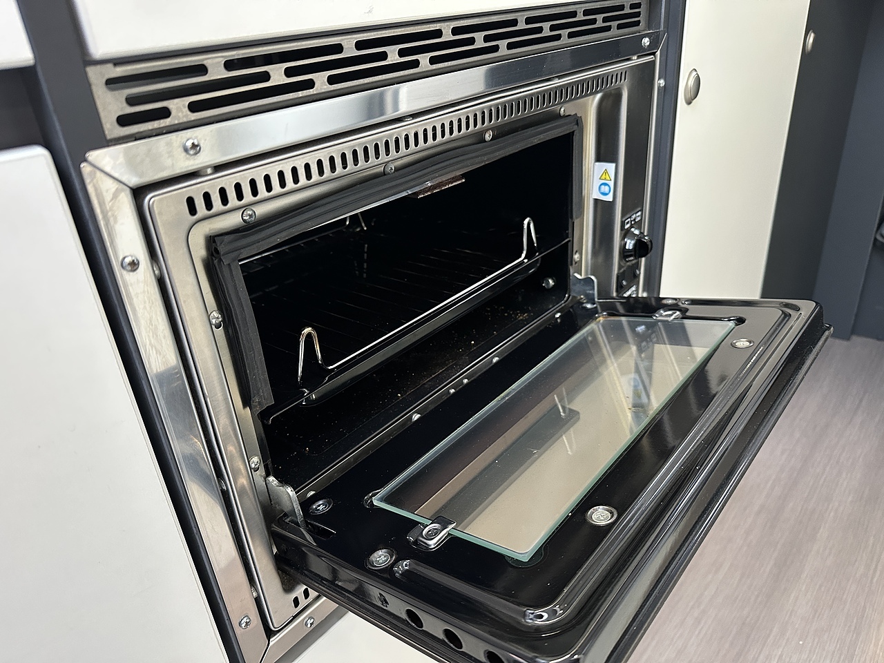 The central kitchen is well appointed with a two-burner gas hob, stainless-steel sink, and 90L fridge/freezer, all complemented by high-quality soft-close cabinetry. The side washroom incorporates a fold-away sink, cassette toilet, and shower, finished to Adria’s high standard.