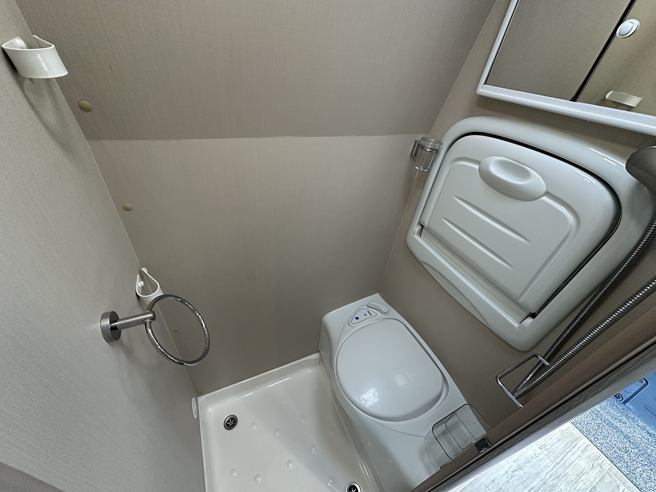 A compact but fully featured washroom includes a shower, electric flush toilet, wash basin, and mirrored vanity unit. The space is practical and easy to maintain, ideal for comfortable touring without compromise.