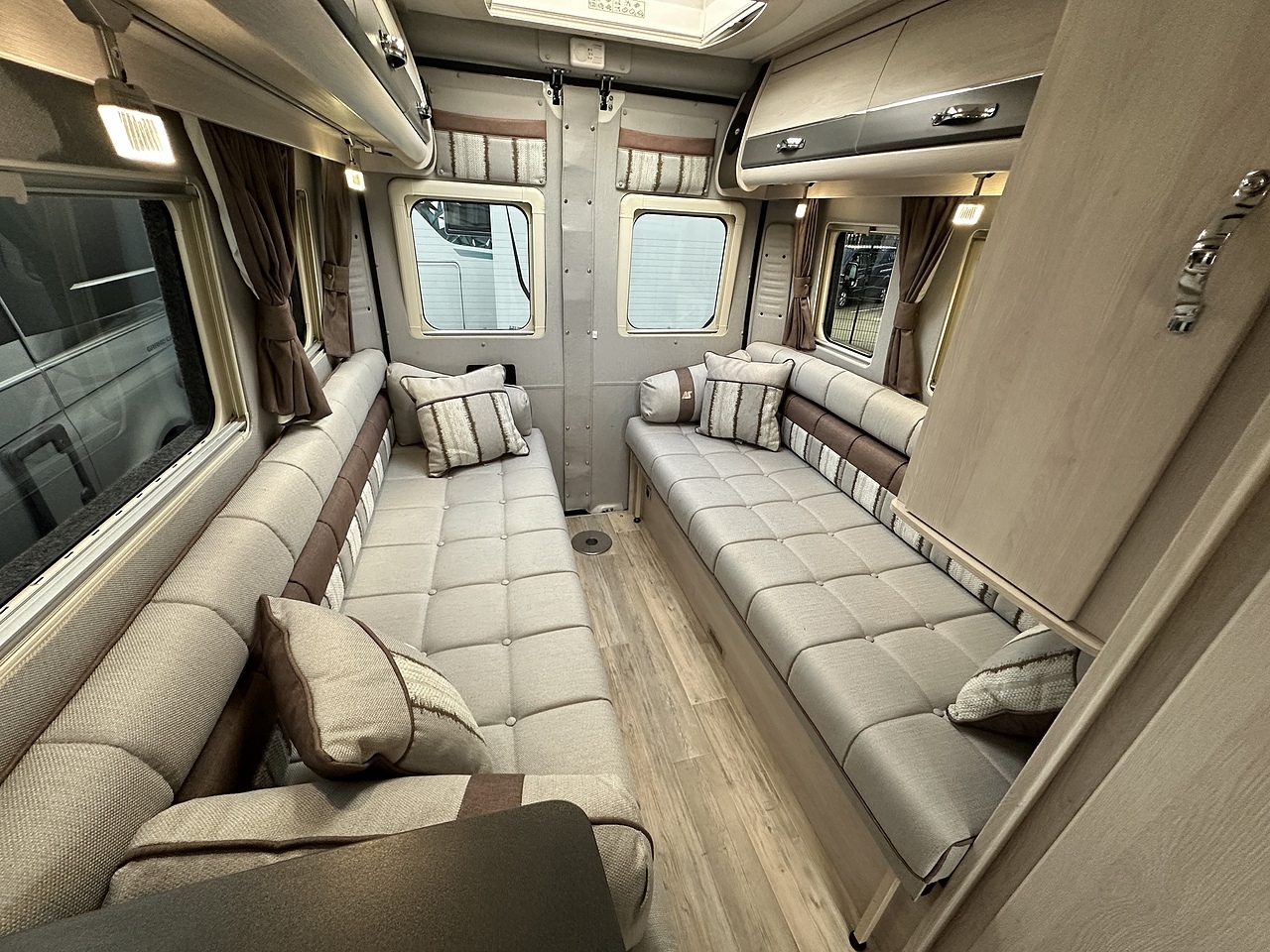 Step inside to find a beautifully crafted interior finished with high-grade upholstery, and coordinated soft furnishings. The bright and airy rear lounge offers ample seating for relaxing, dining, or entertaining, and converts easily into your choice of single or double sleeping configuration.
