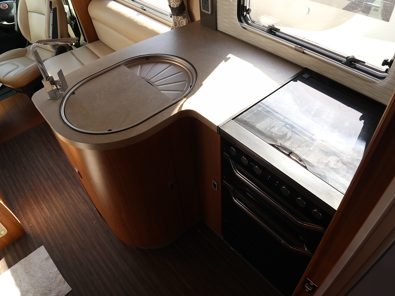 The cooking facilities are also split across the central aisle, featuring Dometic’s practical new drawer fridge freezer on the nearside and an L-shaped kitchen opposite."