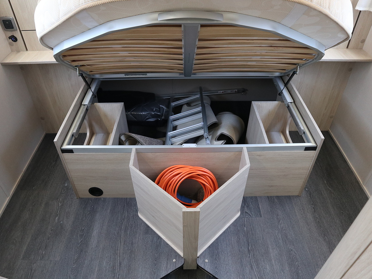 Optional Drop-down Bed: An electric drop-down double bed over the lounge is a common optional extra for families.