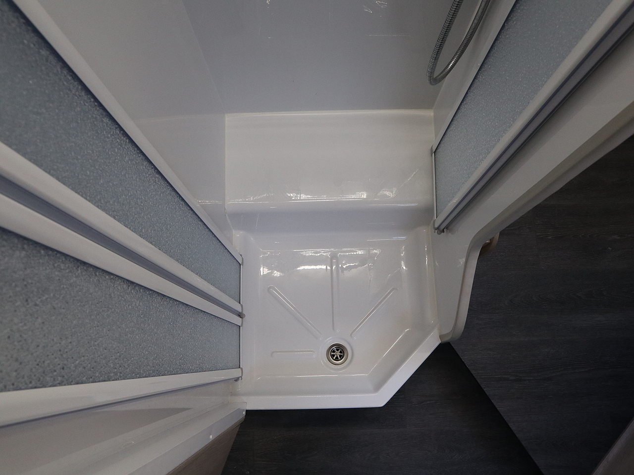 Washroom: Features a "split" design with a separate shower cubicle on one side and a toilet/basin area on the other.