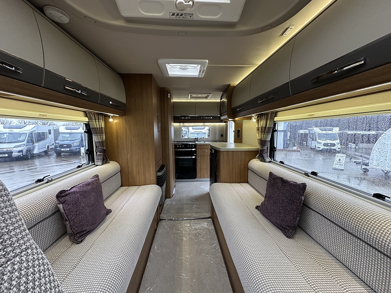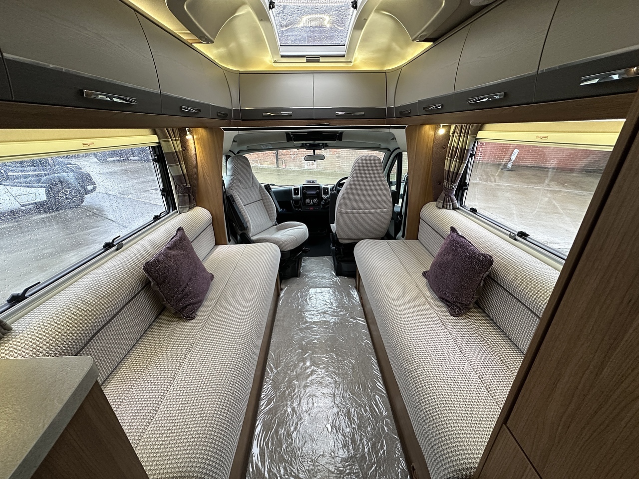 The seating area easily converts into a large and comfortable double bed, providing excellent sleeping accommodation. High-quality upholstery, overhead lockers, under-seat storage, and a panoramic skylight all add to the open and airy feel of the interior.