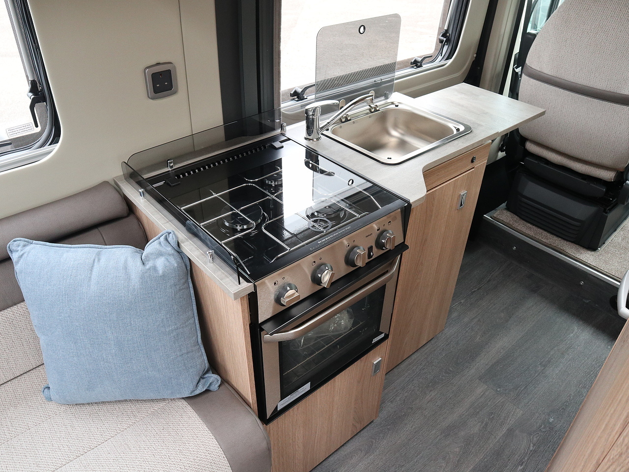 The layout consist of a rear lounge, that can easily be converted into a bed (1.86m x 1.32m/6'1" x 4'3"). It comes with a well equipped kitchen, features include; stainless steel sink, 3 burner hob, oven & grill, 3 way refrigerator with integrated freezer and a 800w microwave.