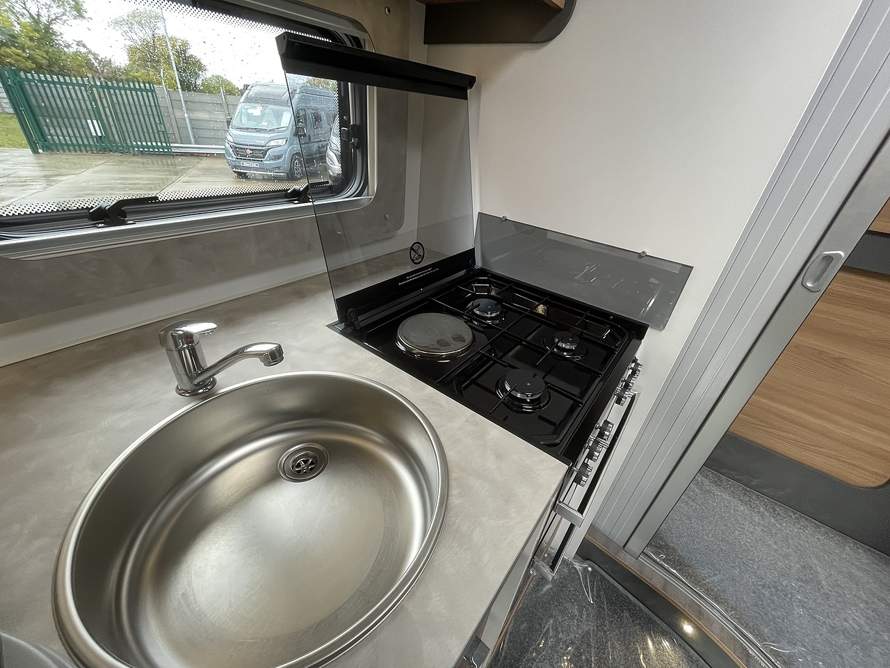 The compact design makes it incredibly easy to maneuver and park, even in tight spaces, without sacrificing any of the living comforts you’d expect from a larger motorhome. With its eye-catching white exterior, contemporary alloy wheels, and large panoramic windows, this motorhome exudes a sense of adventure while still maintaining a sophisticated, high-quality look.