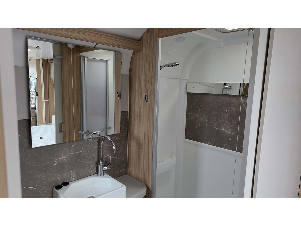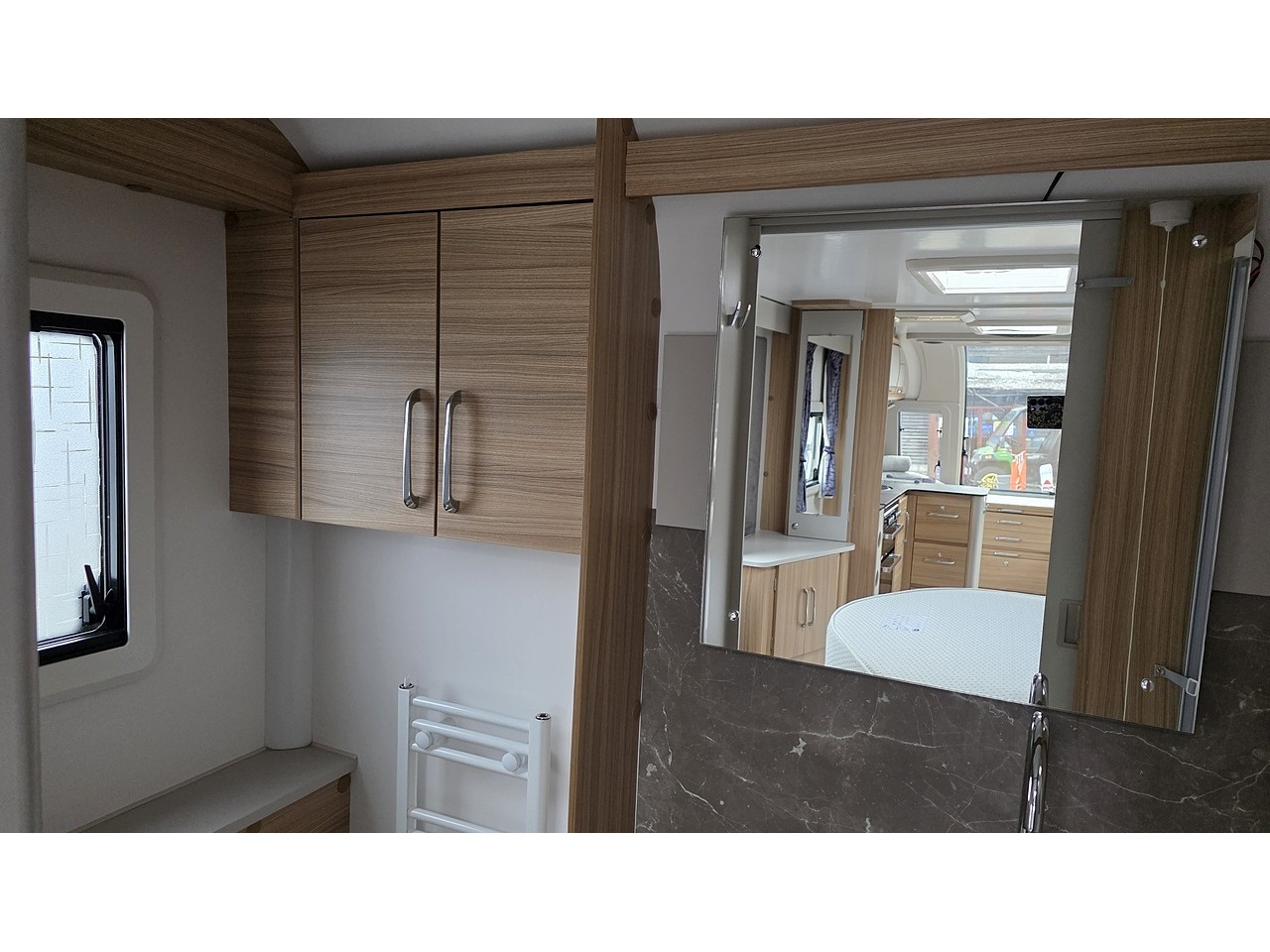 Spacious & Elegant Layout – Twin‑axle, 8‑ft‑wide body shell with a rear transverse island king‑size bed, generous wardrobes and bedside units, and a full‑width end washroom with a large shower cubicle and dressing area.
