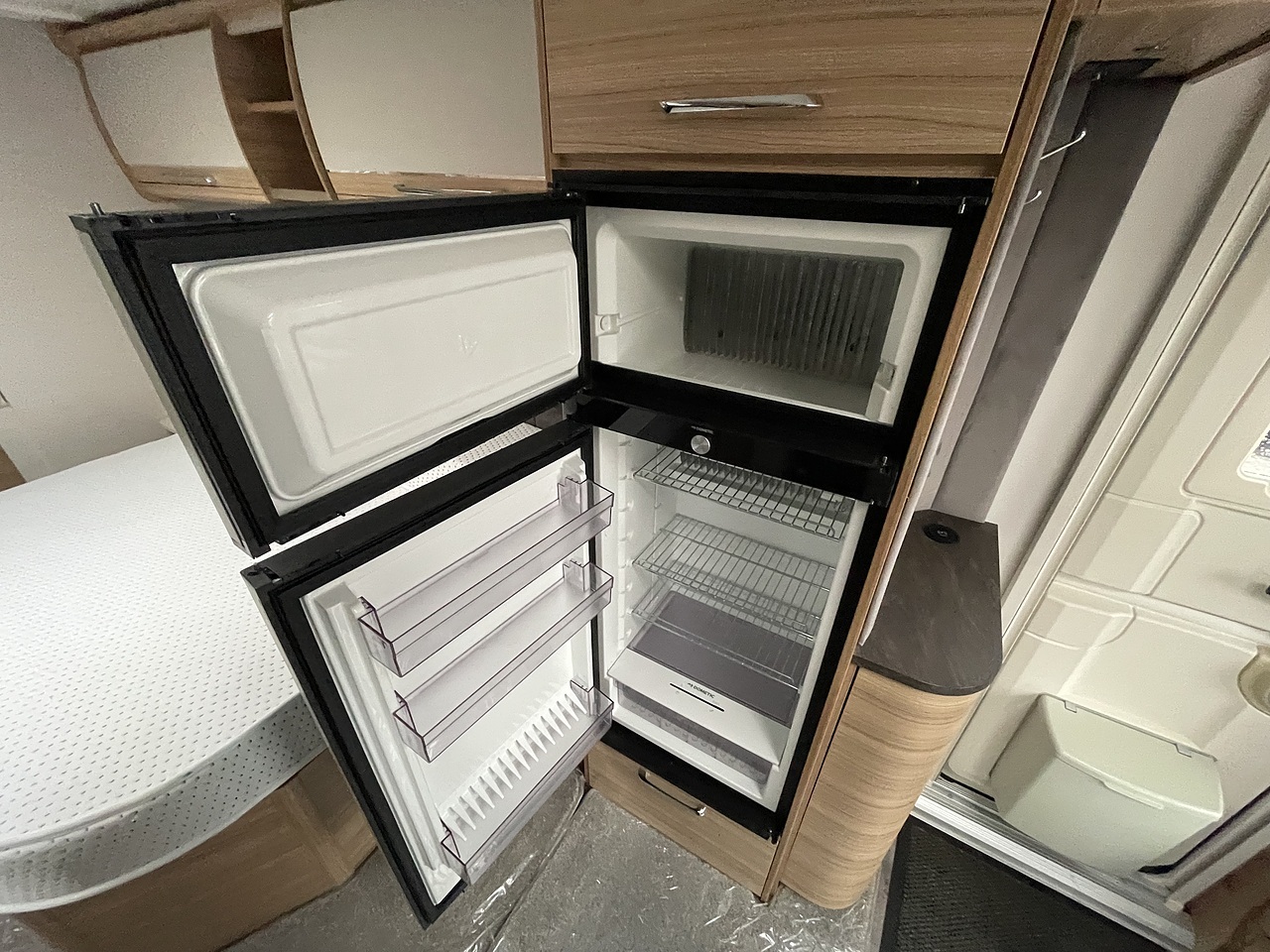 Top‑Tier Kitchen & Appliances – L‑shape kitchen with premium surfaces, high‑quality appliances (e.g. Dometic tower fridge/freezer, 10‑series models), integrated microwave, wine rack, elegant sink and mixer taps. Practical and stylish.