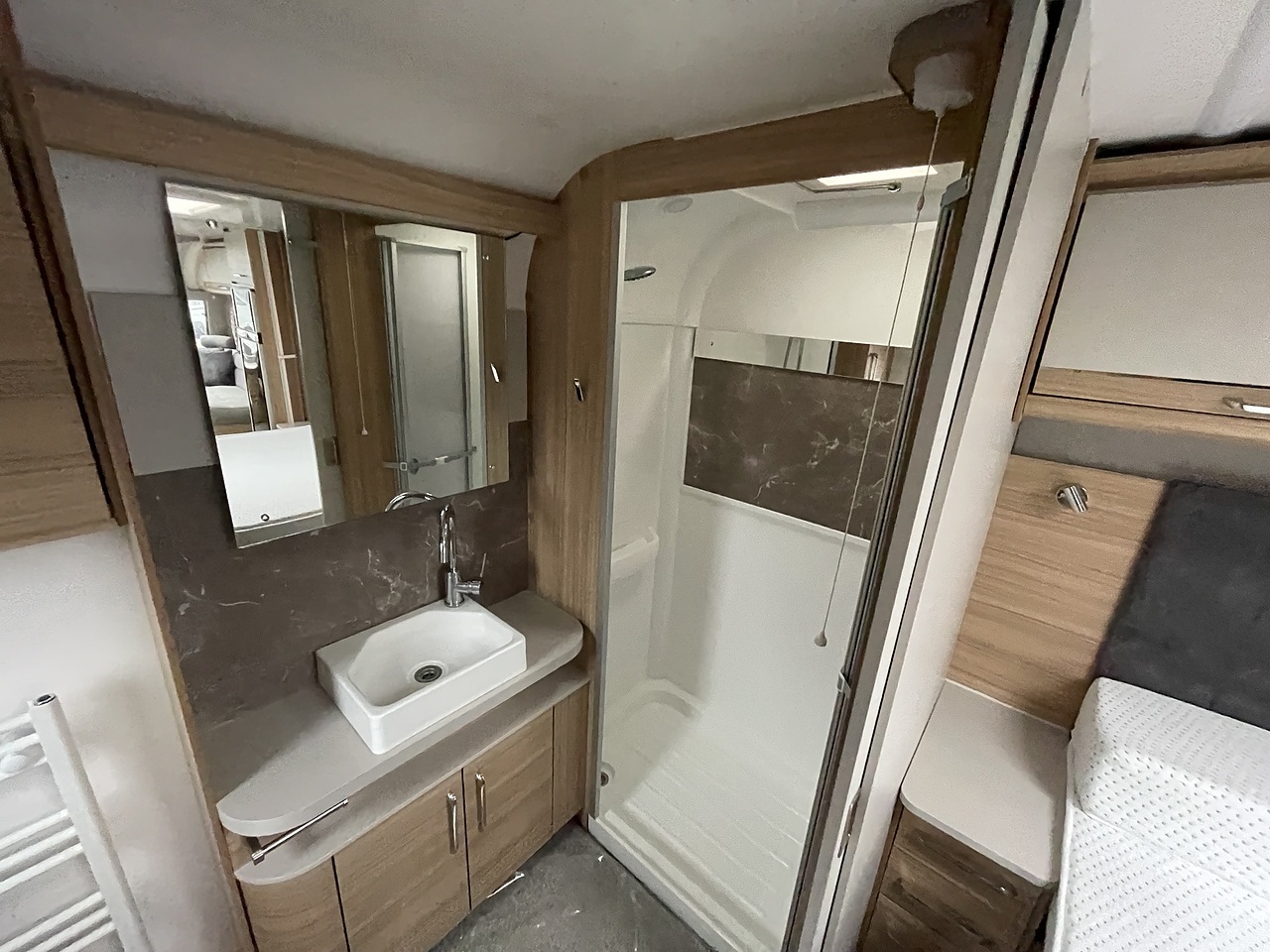Spacious & Elegant Layout – Twin‑axle, 8‑ft‑wide body shell with a rear transverse island king‑size bed, generous wardrobes and bedside units, and a full‑width end washroom with a large shower cubicle and dressing area.