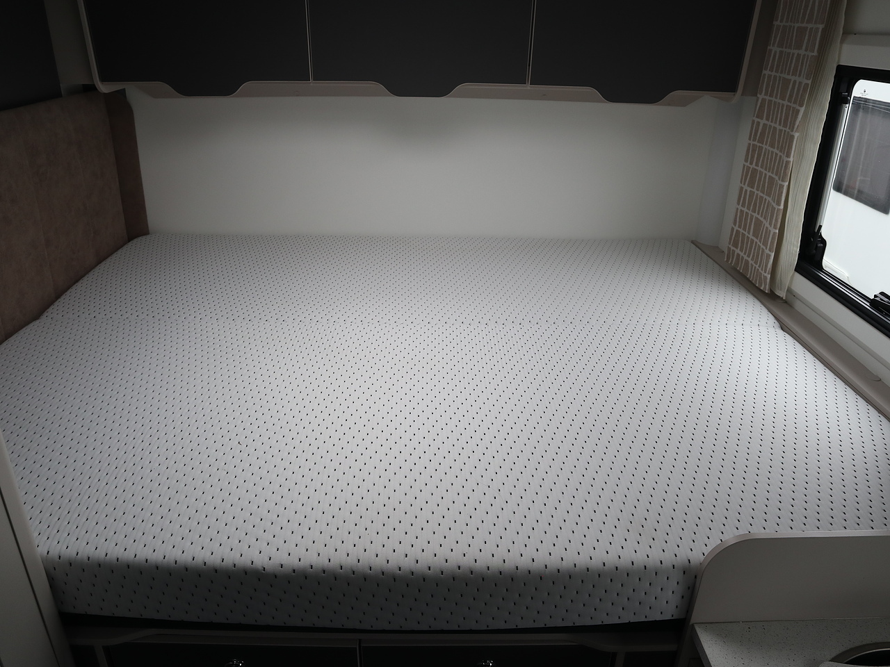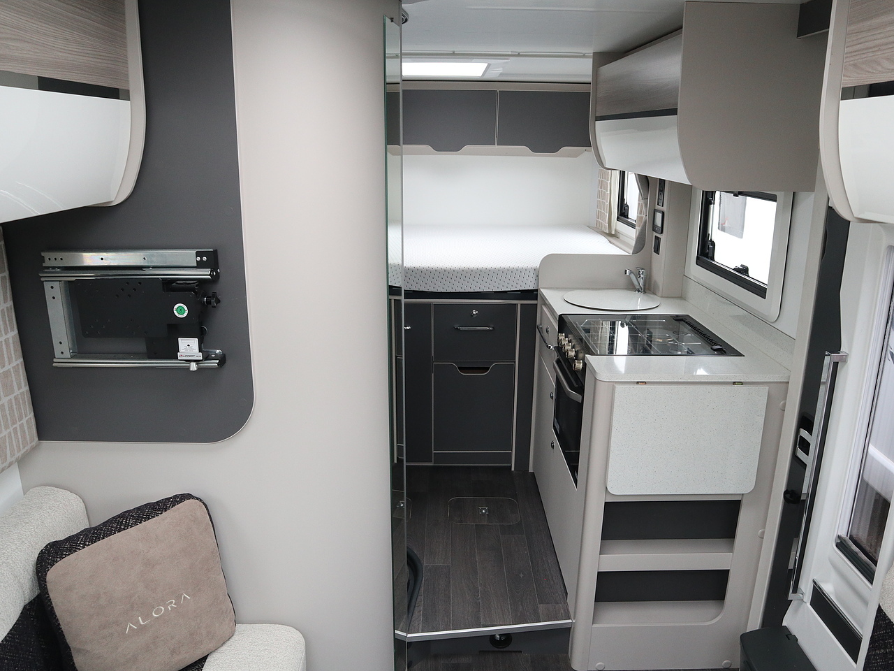 Sleeping Areas: Features a fixed rear transverse double bed and a front "flexi-lounge" that converts into a second double bed for a total of four berths.