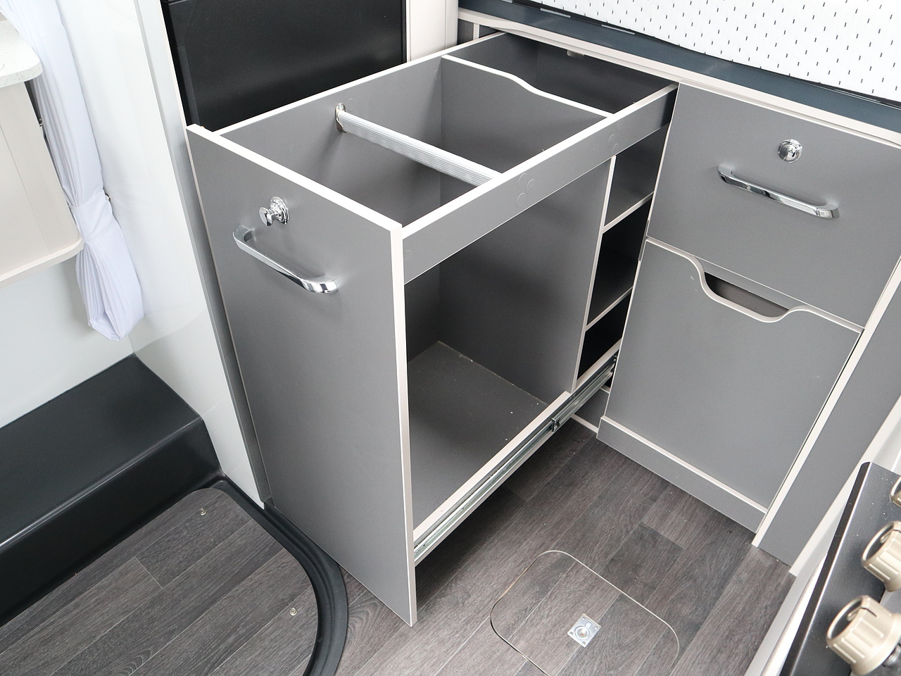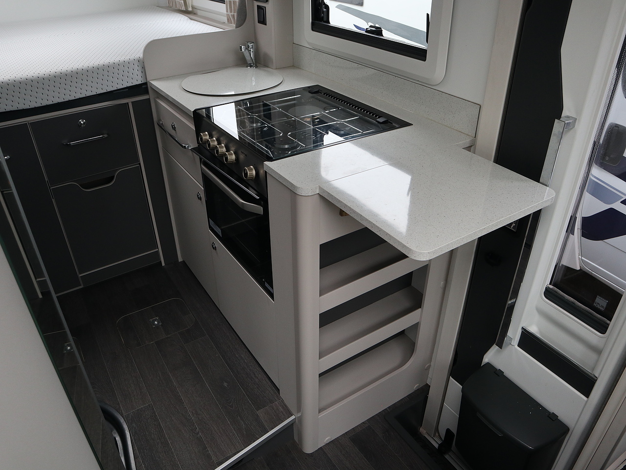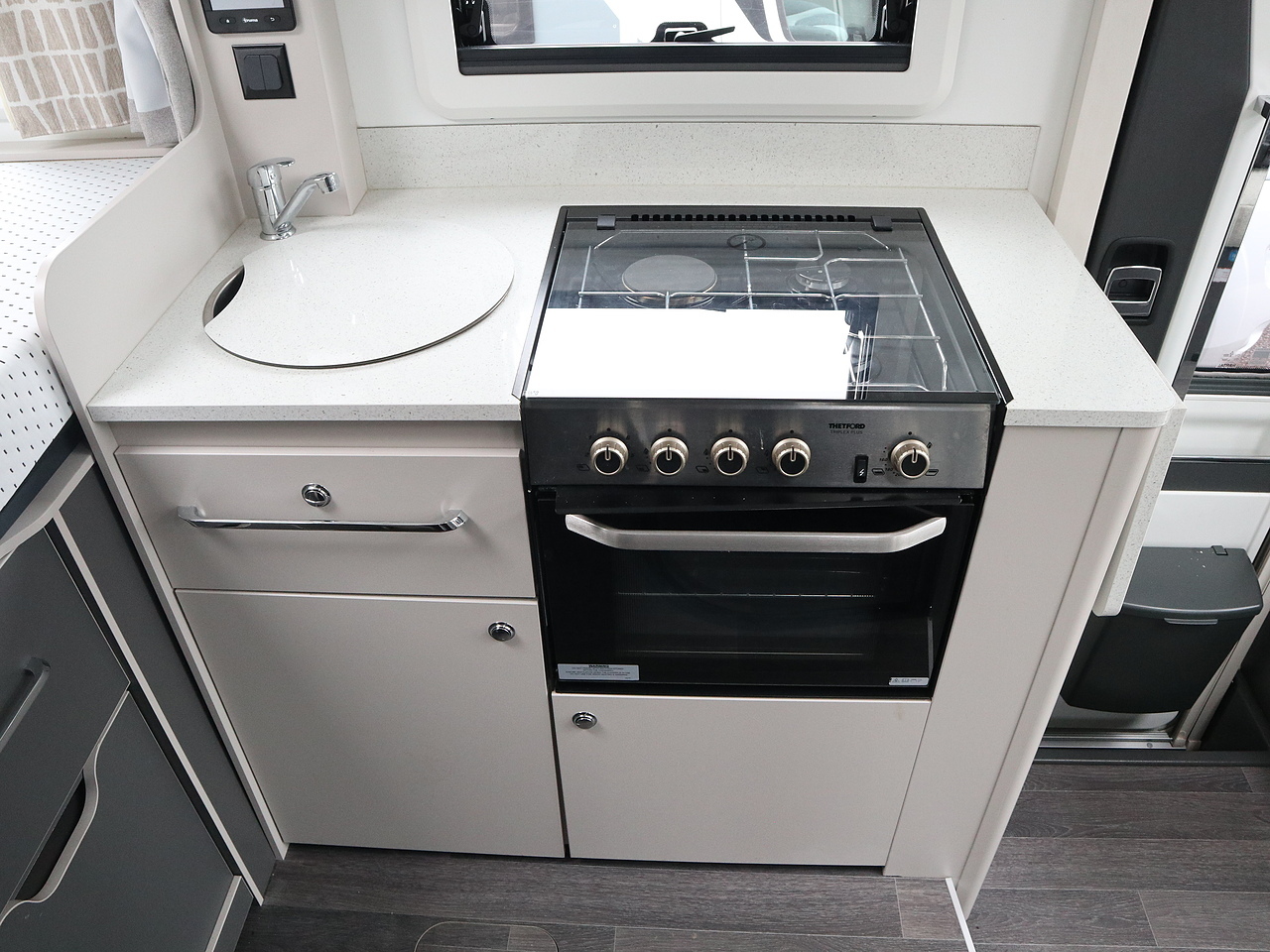 Kitchen: Fully equipped with a Thetford 138L-141L compressor fridge, a 3-ring gas hob with electric hotplate, and a combination oven and grill.