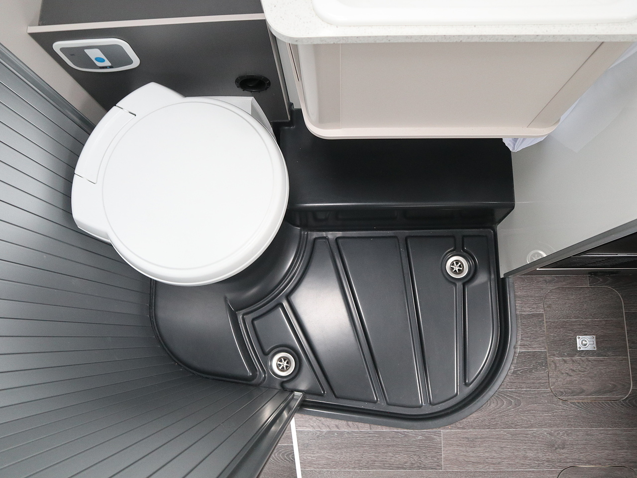 Washroom: Space-saving design with a sliding sink unit and a tambour partition door to maximize corridor space.