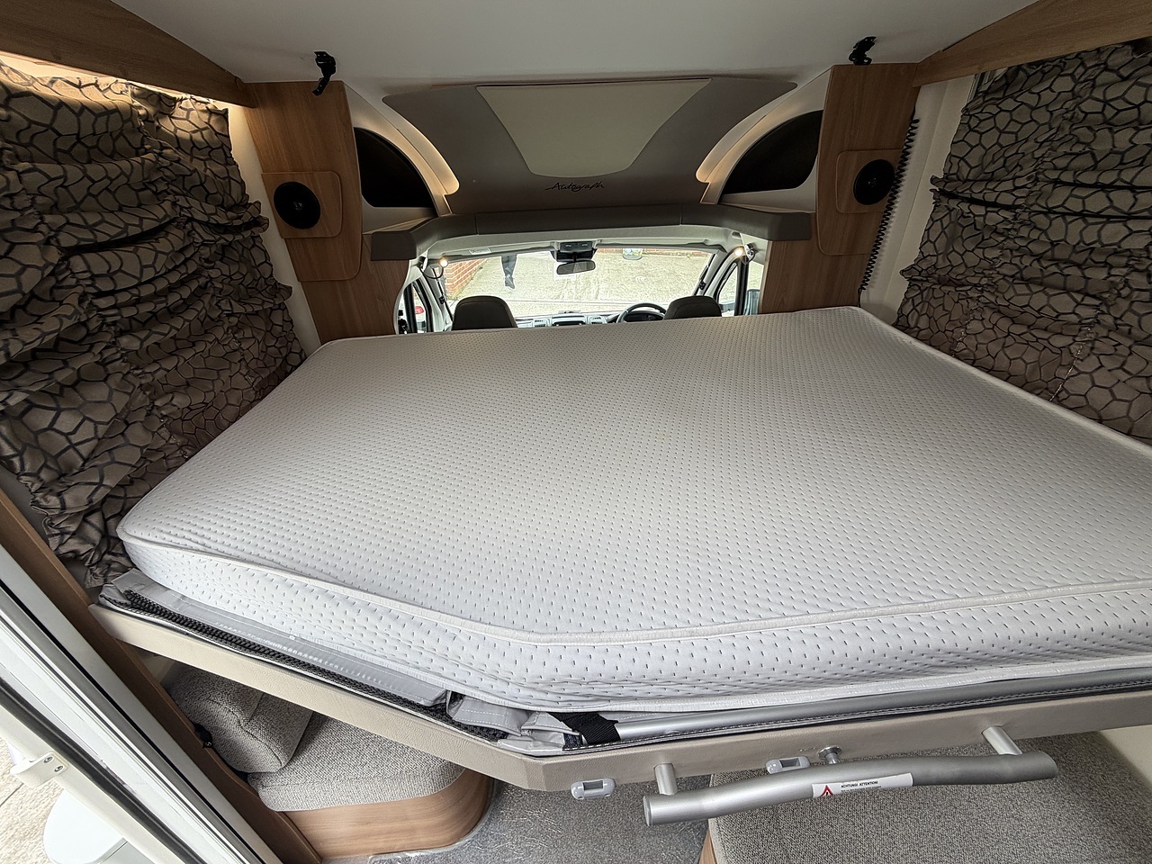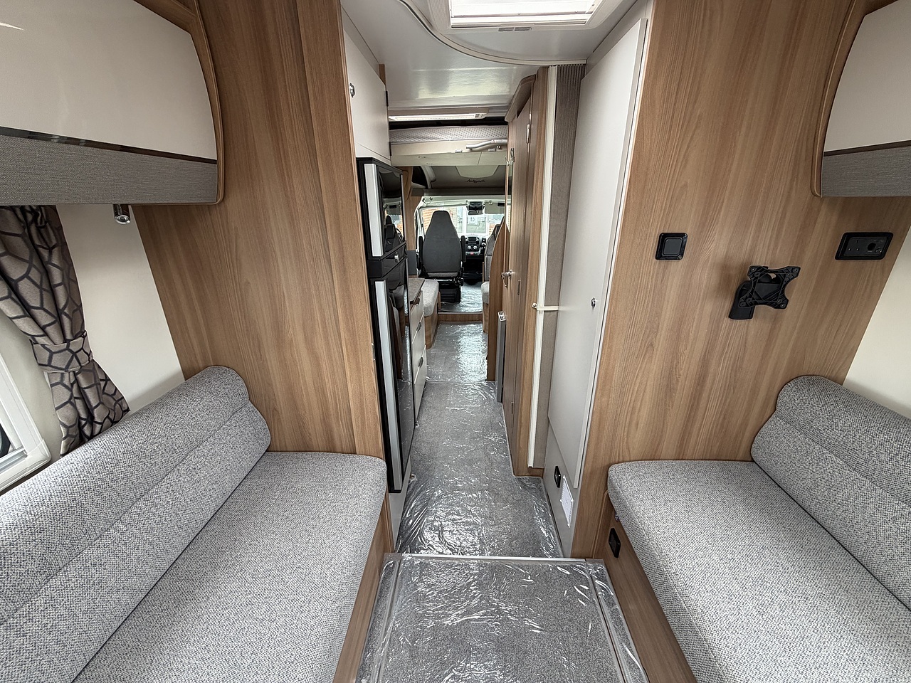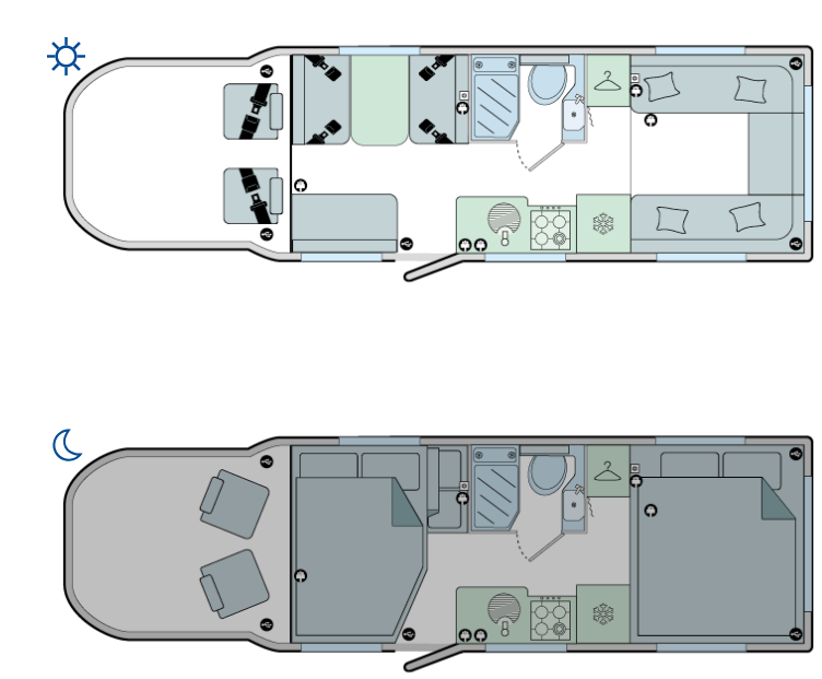 At over 8 metres in length, this model offers an incredibly spacious interior. The layout features a large rear lounge, which converts into a comfortable double bed, alongside a front lounge that also makes into a double. In addition, there is a ceiling-mounted drop-down double bed, providing flexible sleeping arrangements for up to six people.