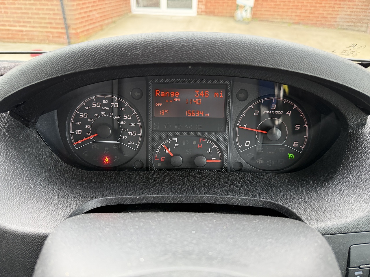 Cab specification includes cruise control, cab air conditioning, DAB radio with Bluetooth connectivity, satellite navigation, reversing camera, and fully adjustable captain’s chairs with armrests.