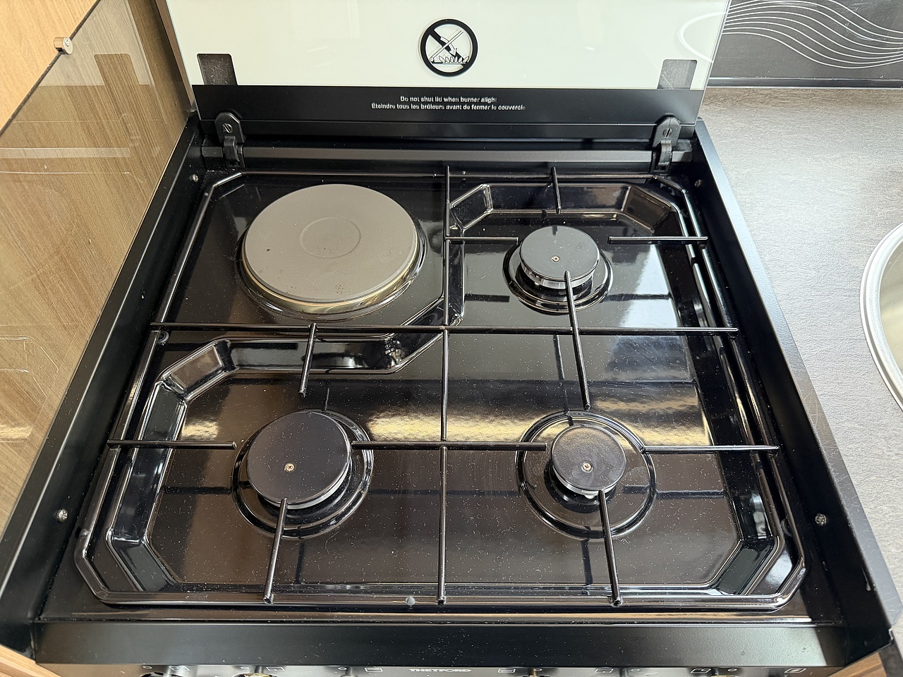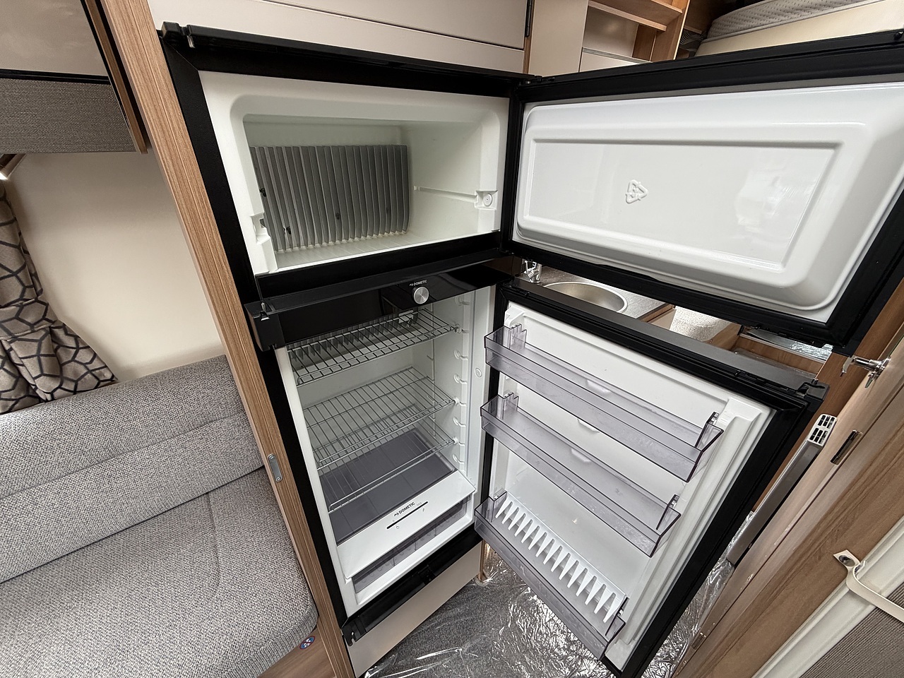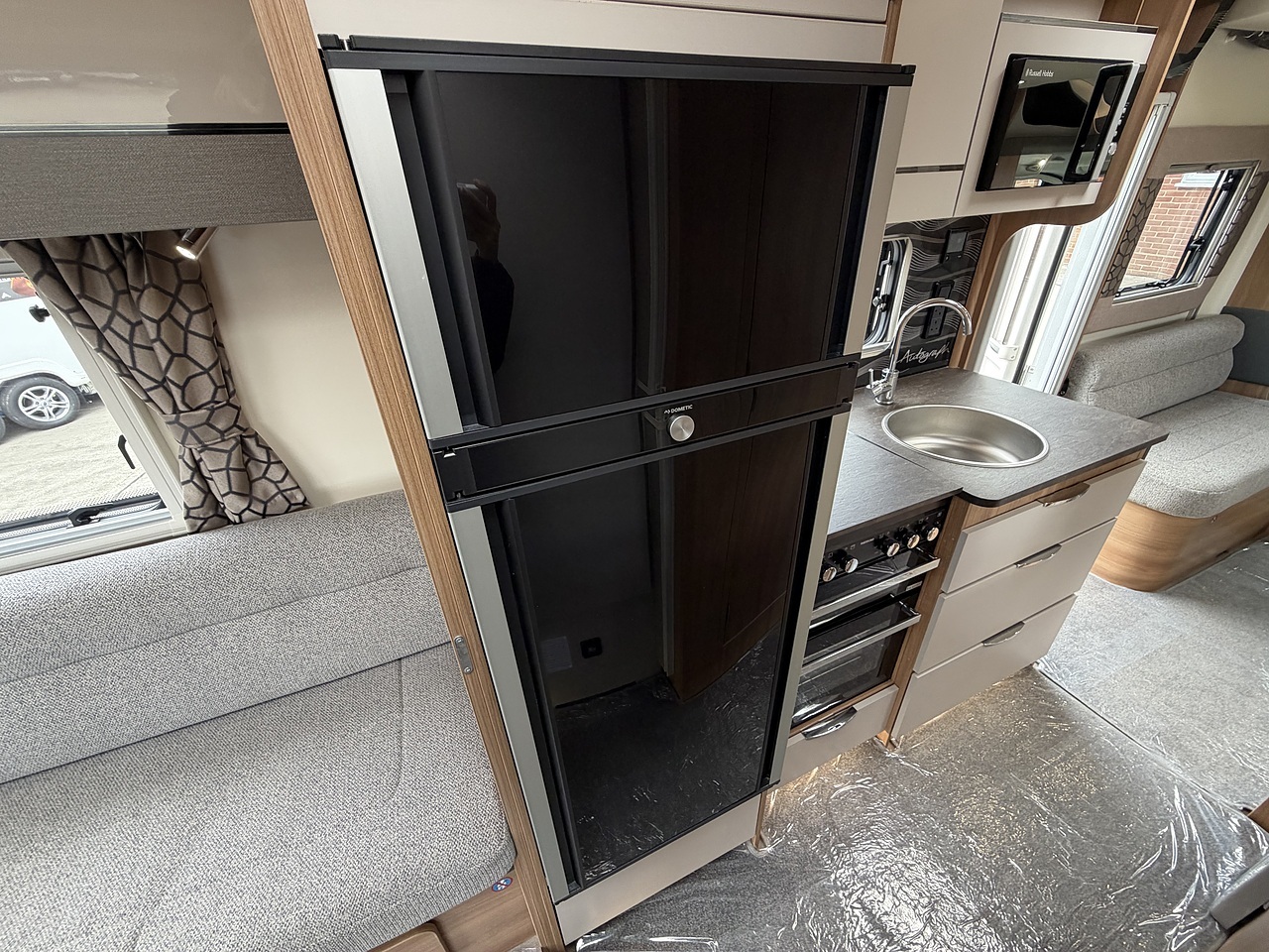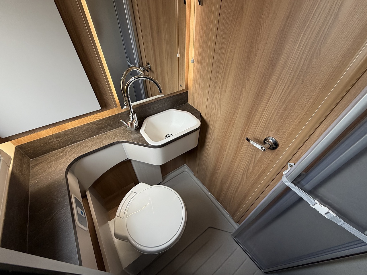 The well-appointed kitchen is equipped with a Thetford combined oven, grill and dual-fuel hob, microwave, and a large Dometic 153L fridge freezer—ideal for extended trips. The washroom includes a lined shower cubicle with bi-fold partition door, toilet and vanity unit, ensuring all the conveniences of home on the road.