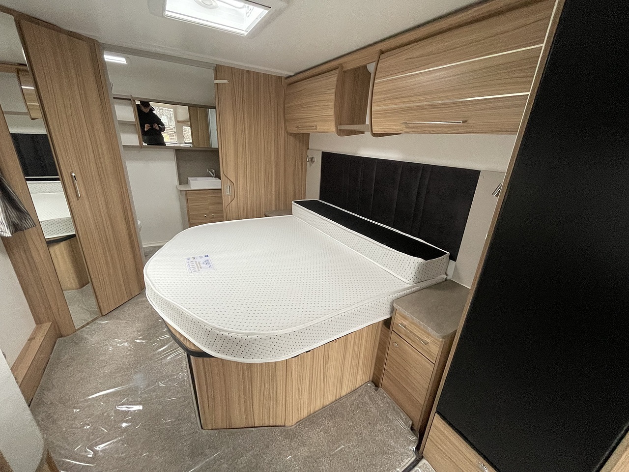 At the rear, the caravan features a fixed island bed layout with: