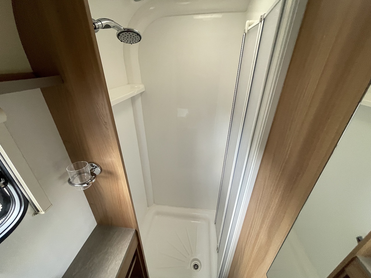 Moving towards the rear, the caravan benefits from a transverse fixed island bed, offering easy access from both sides and a dedicated sleeping area without the need for daily setup. At the back, the full-width end washroom includes a separate shower cubicle, toilet, and vanity unit, providing a spacious and functional washroom area.